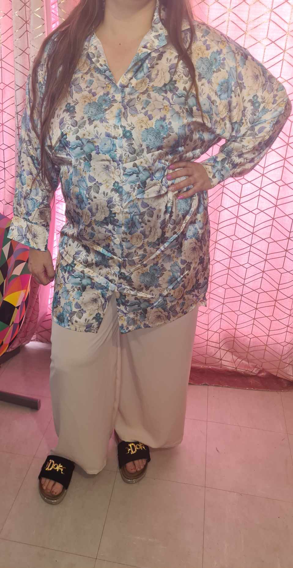 Ensemble palazo (pantalon coupe large) avec une chemise longue matière satiné.