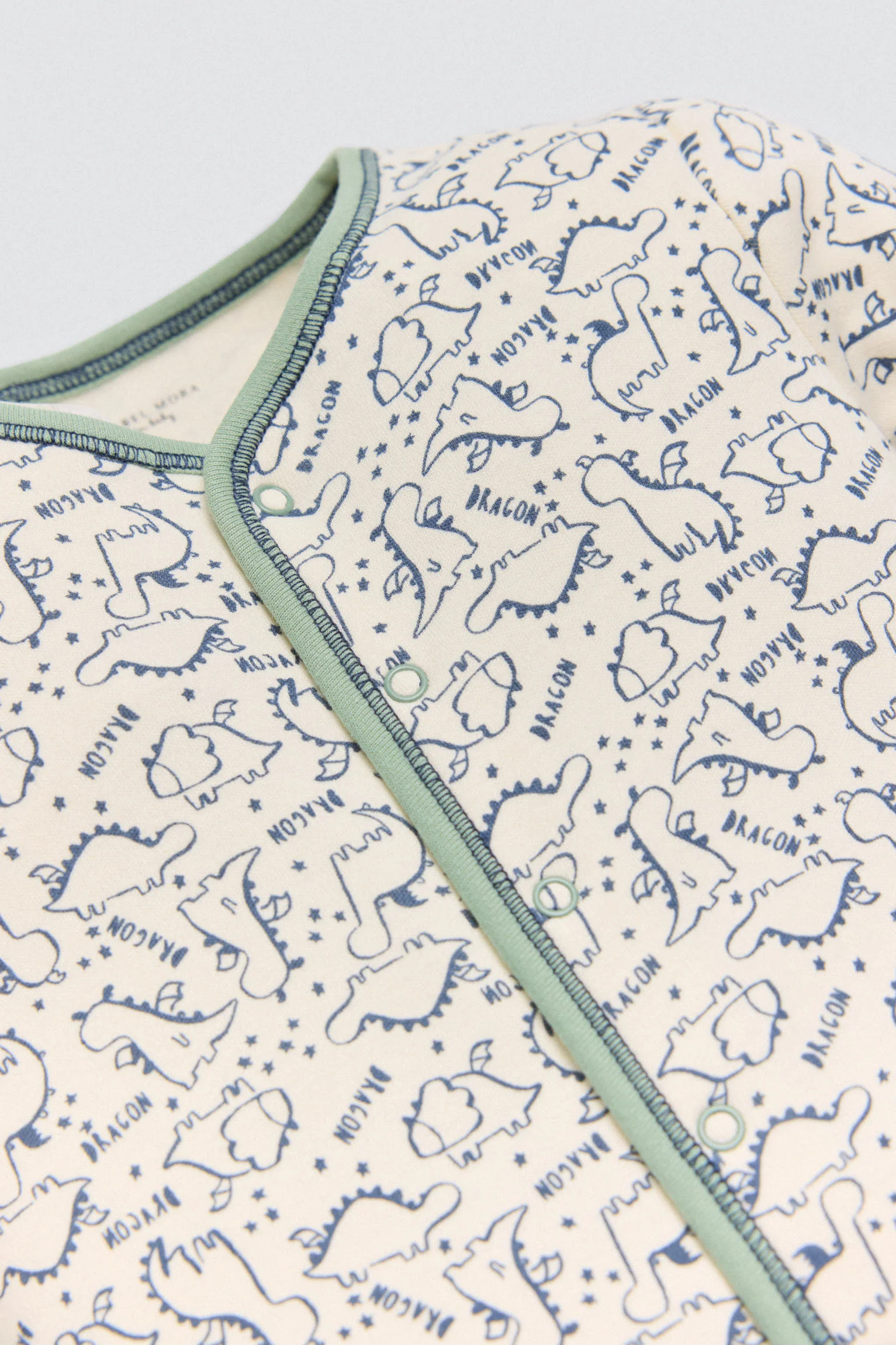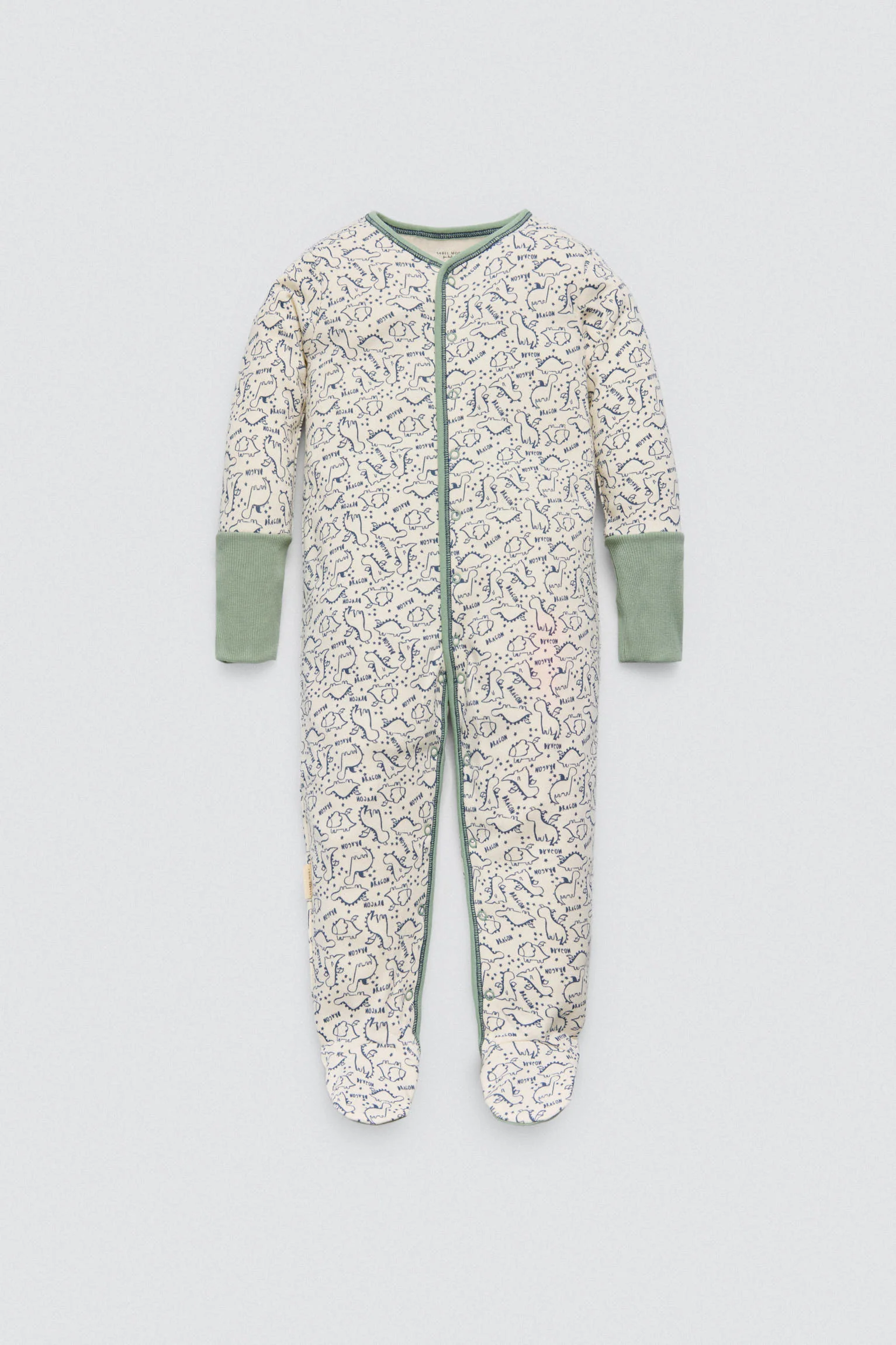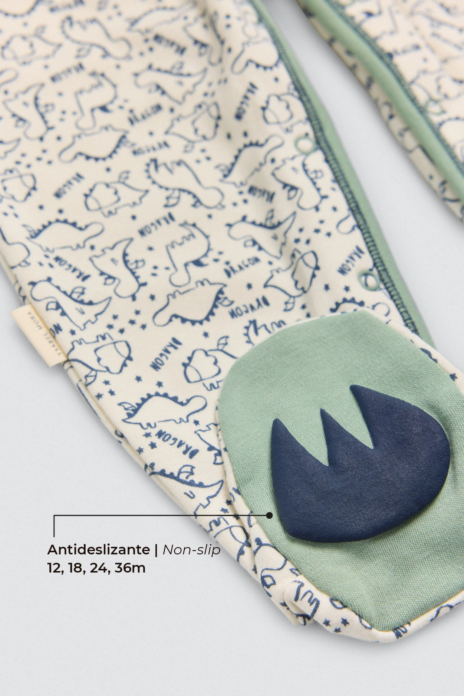 Barboteuse bébé motif dinosaure, pieds intégrés et silicone antidérapant pour plus de sécurité. Intérieur en peluche et fermeture zippée sur le devant. Fabriquée en coton naturel pour un toucher ultra doux.