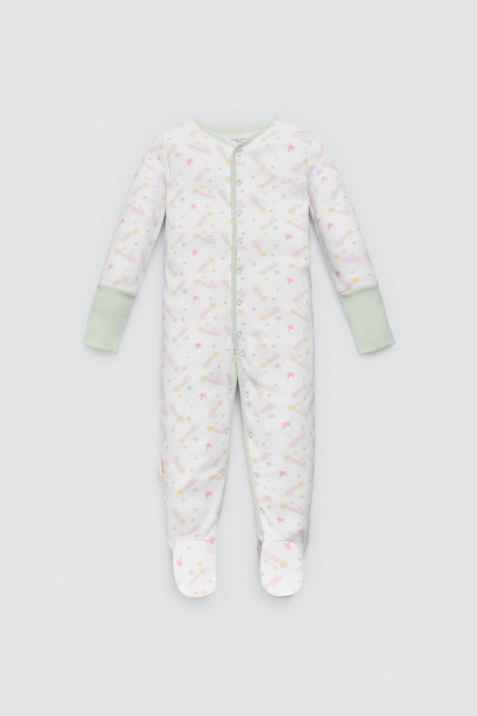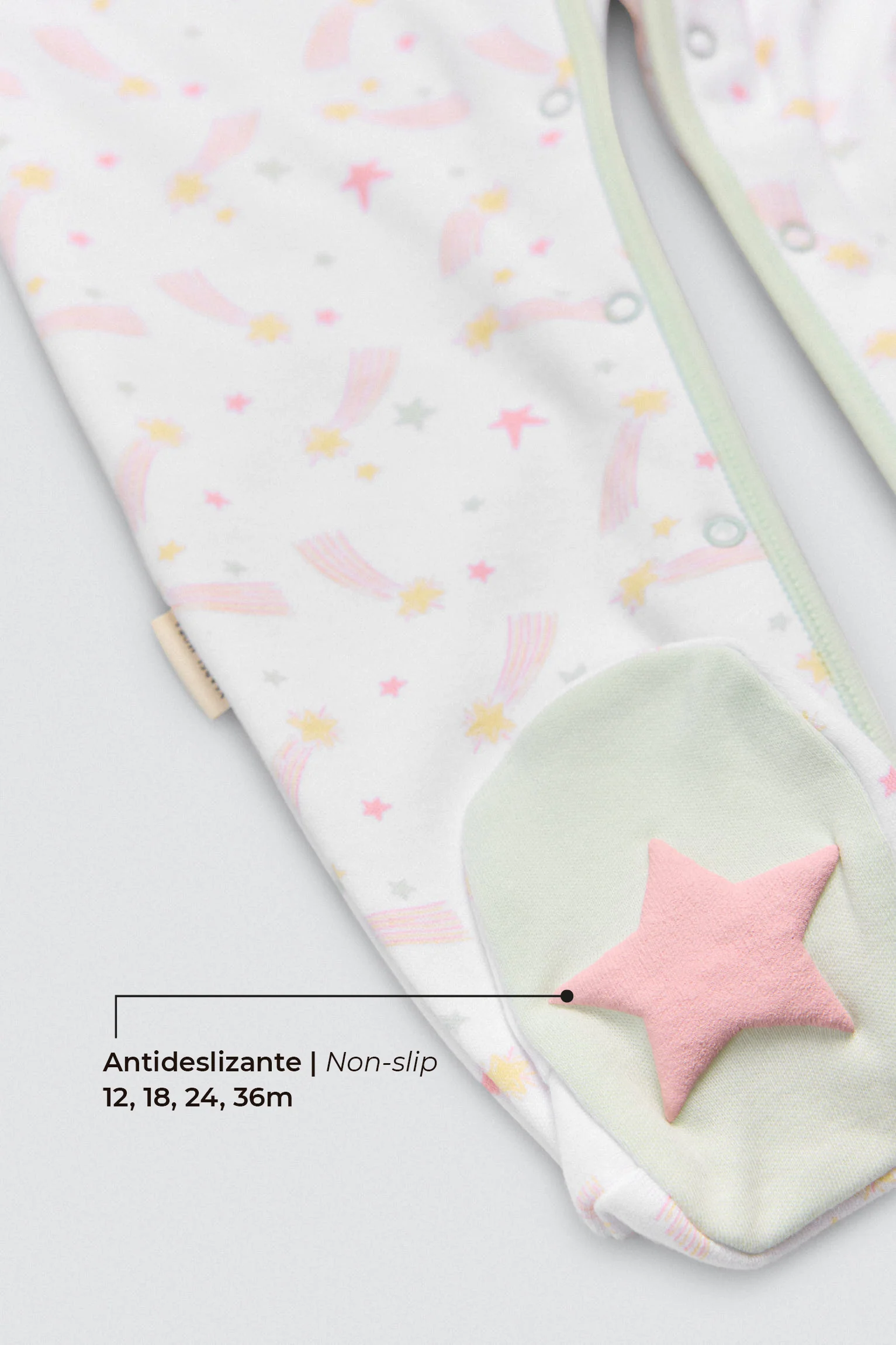 Barboteuse bébé avec intérieur en peluche, fermeture à boutons et pieds antidérapants. Imprimé de la collection Contes de Fées dans des tons pastel. Idéale pour allier chaleur, confort et douceur au quotidien.