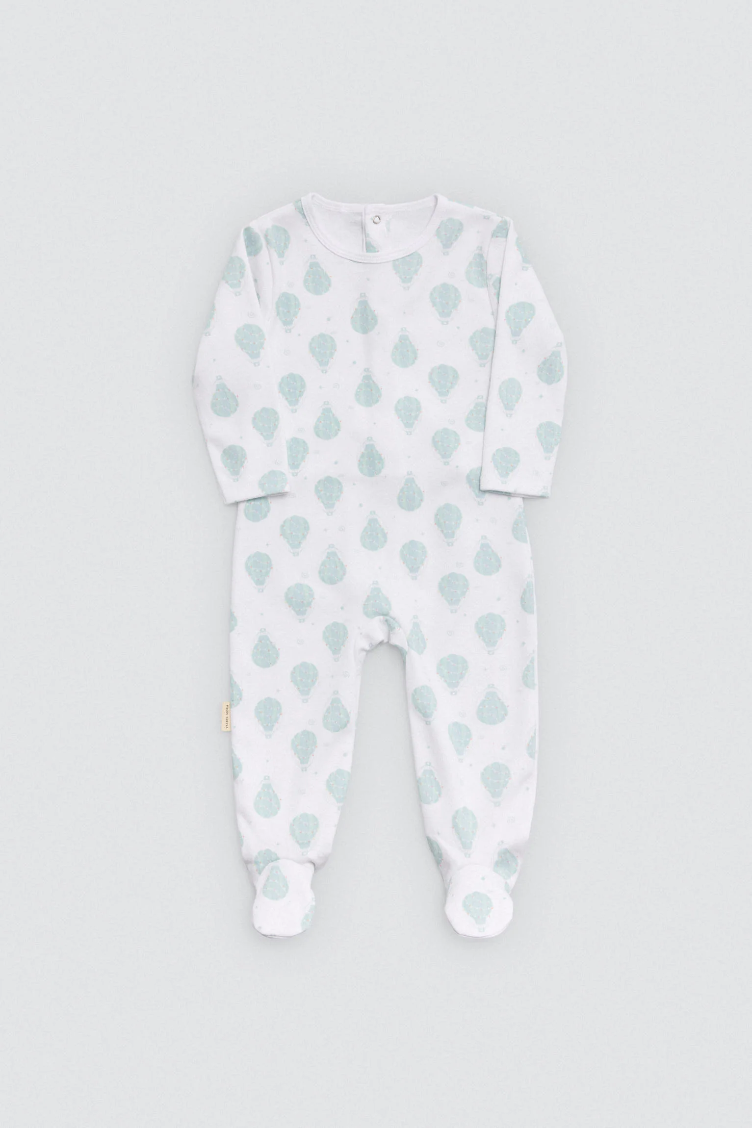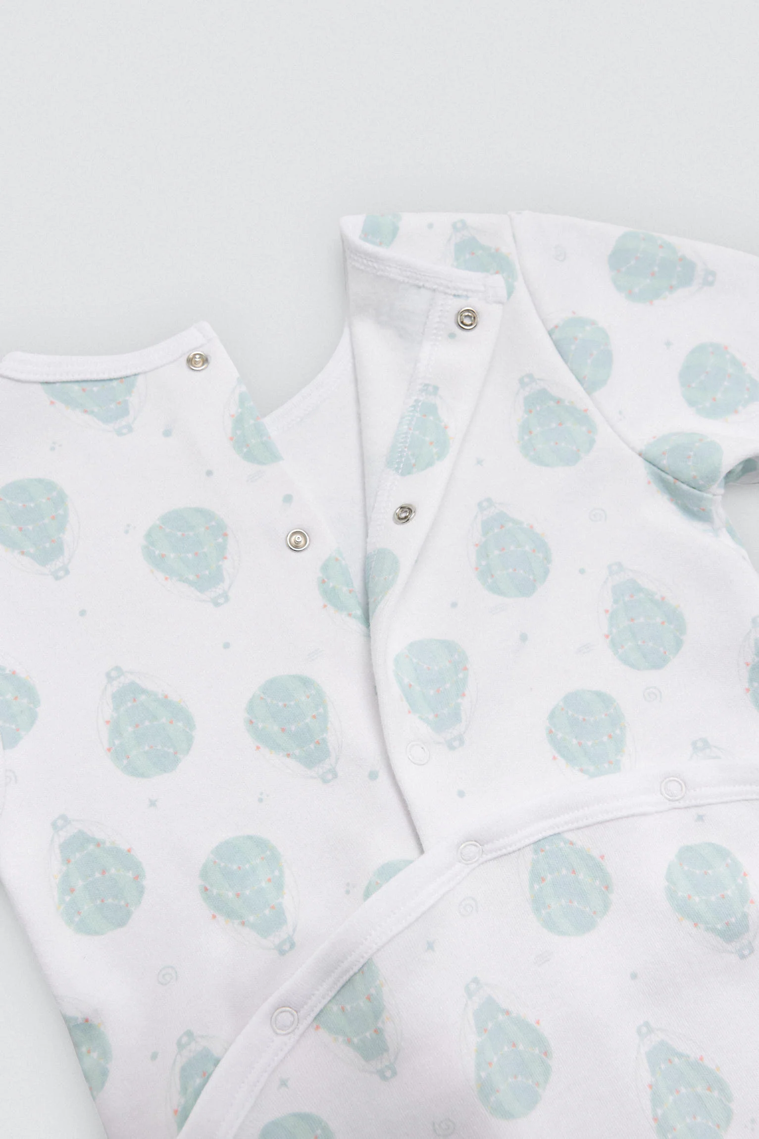 Barboteuse bébé à manches longues avec intérieur en peluche, fermeture à boutons et pieds antidérapants. Imprimé ballons sur fond blanc. Idéale pour les bébés actifs qui commencent à ramper.