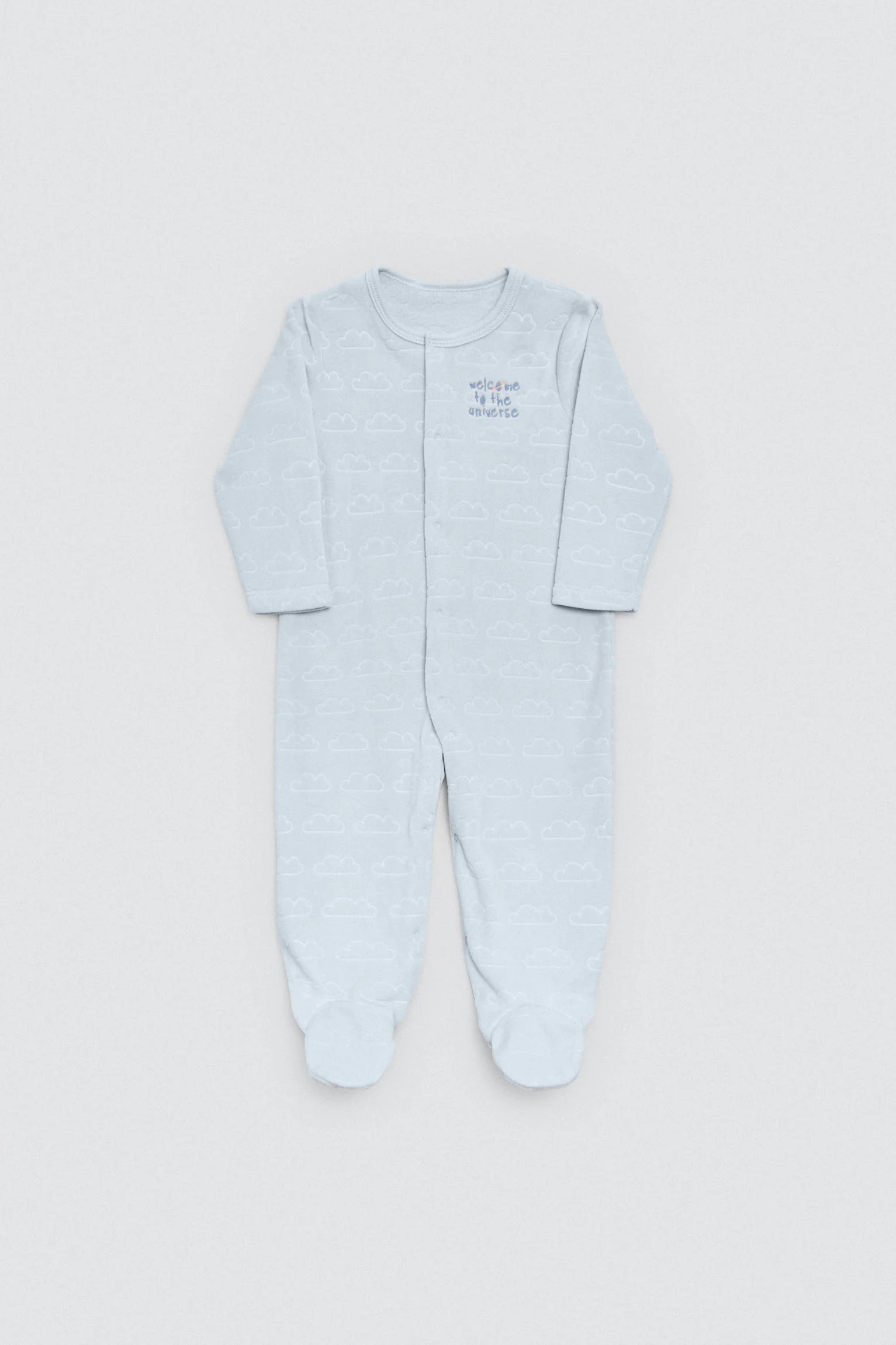 Barboteuse bébé à manches longues avec intérieur en peluche et pieds fermés. Semelle antidérapante en silicone pour plus de sécurité. Fermeture zippée pour un change facile. Imprimé planètes et étoiles.