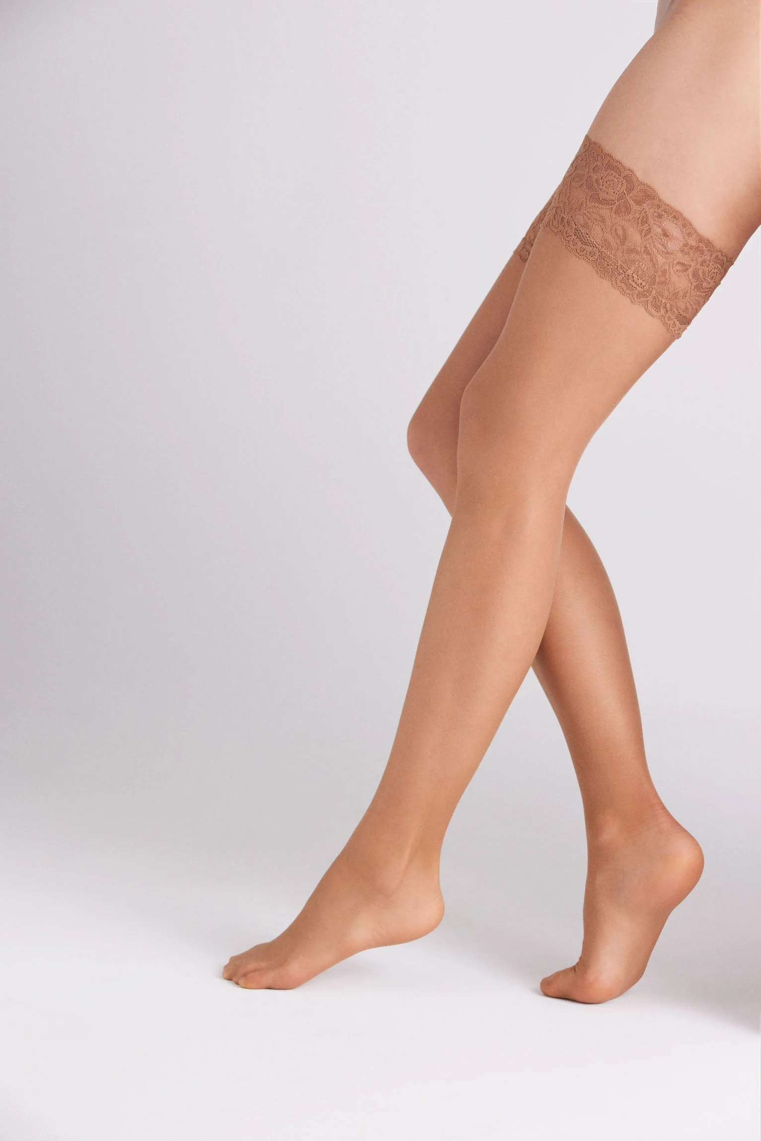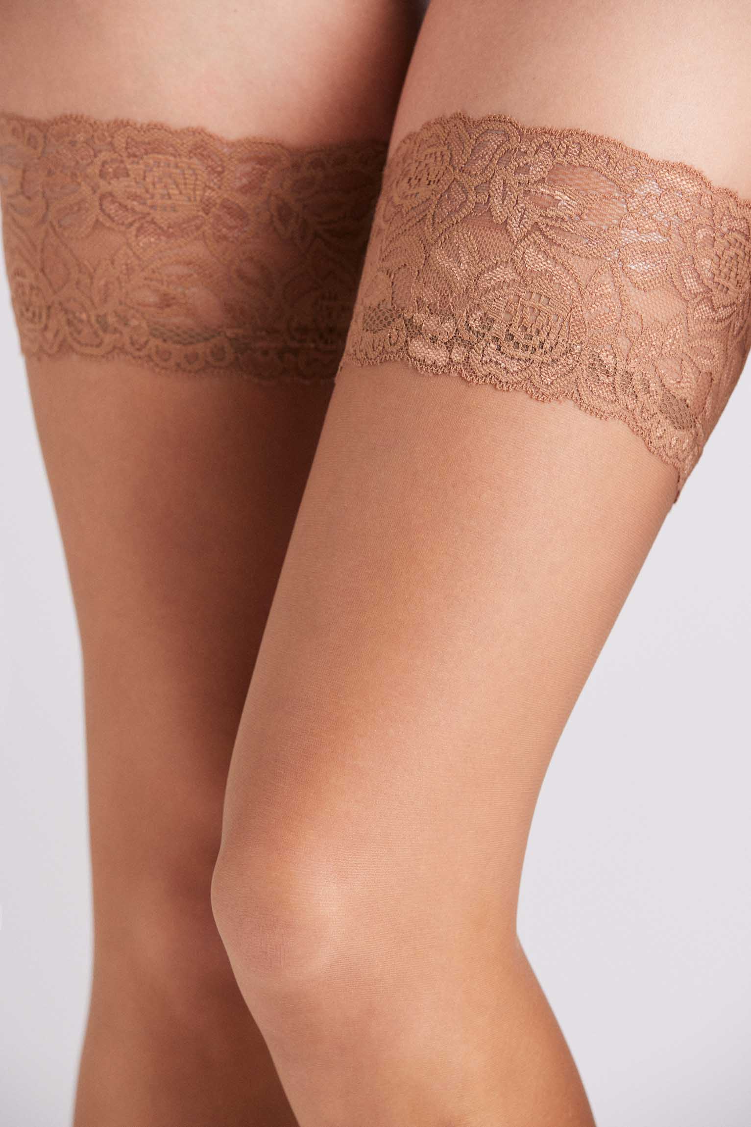 Bas froid 10 DEN avec jarretière en dentelle. Grâce aux propriétés de ses microparticules actives, elles procurent une sensation permanente de fraîcheur et de bien-être. Composition : 88% Polyamide, 12% Elasthanne