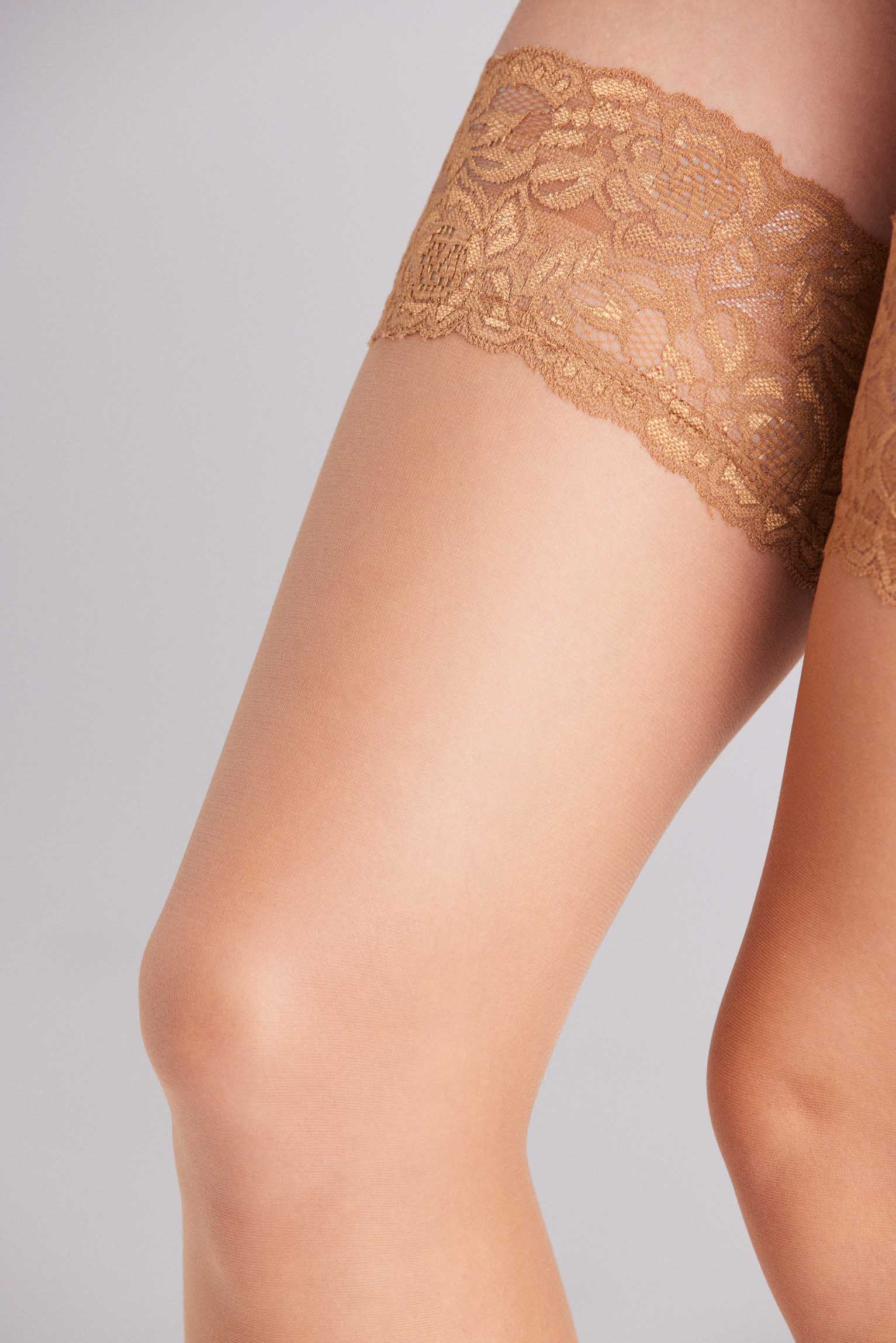 Bas froid 10 DEN avec jarretière en dentelle. Grâce aux propriétés de ses micro-particules actives, elles vous procurent une sensation permanente de fraîcheur et de bien-être. Composition : 88% Polyamide, 12% Élasthanne