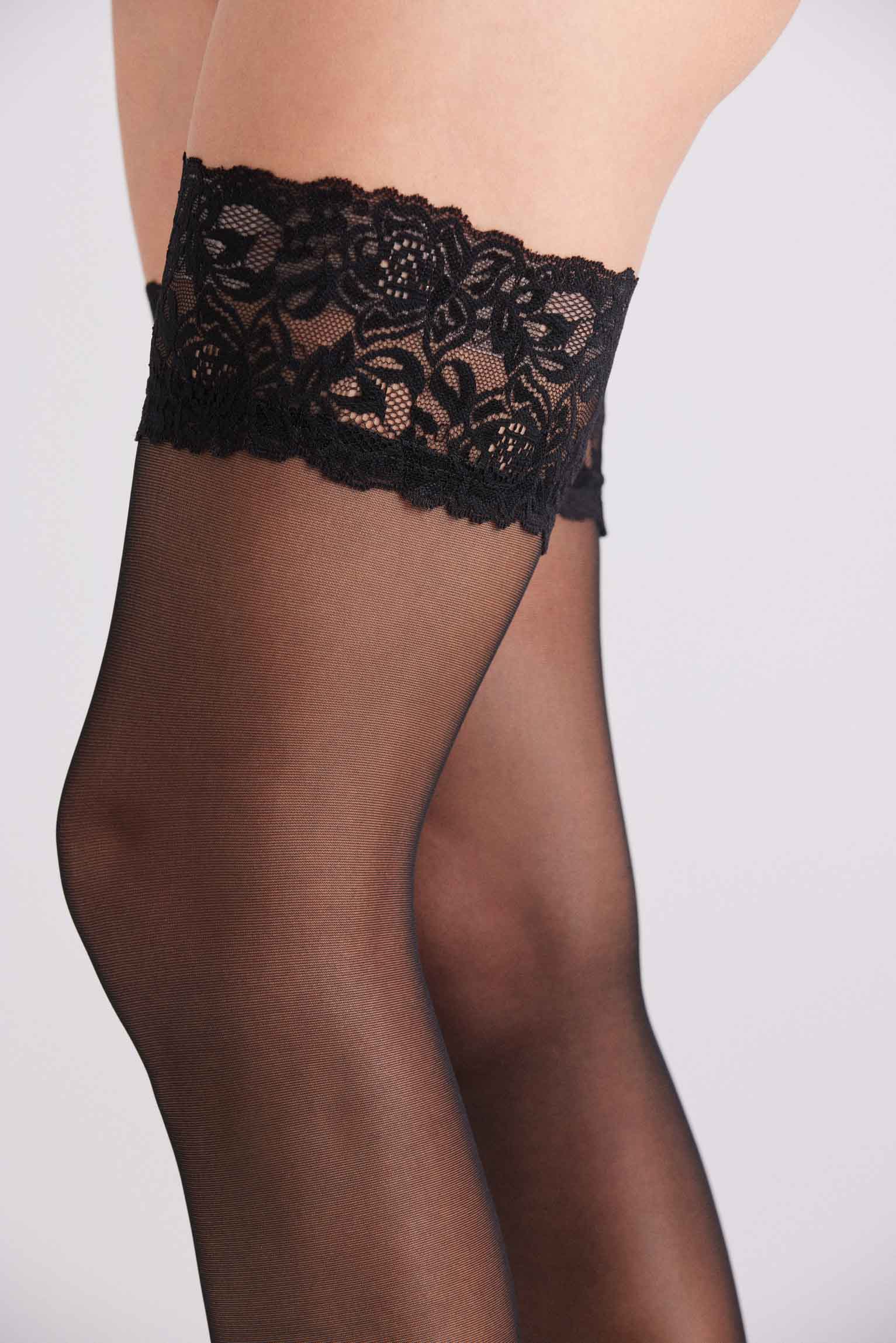 Moyenne 20 DEN. Avec jarretière en dentelle et deux bandes de silicone pour un maintien total.