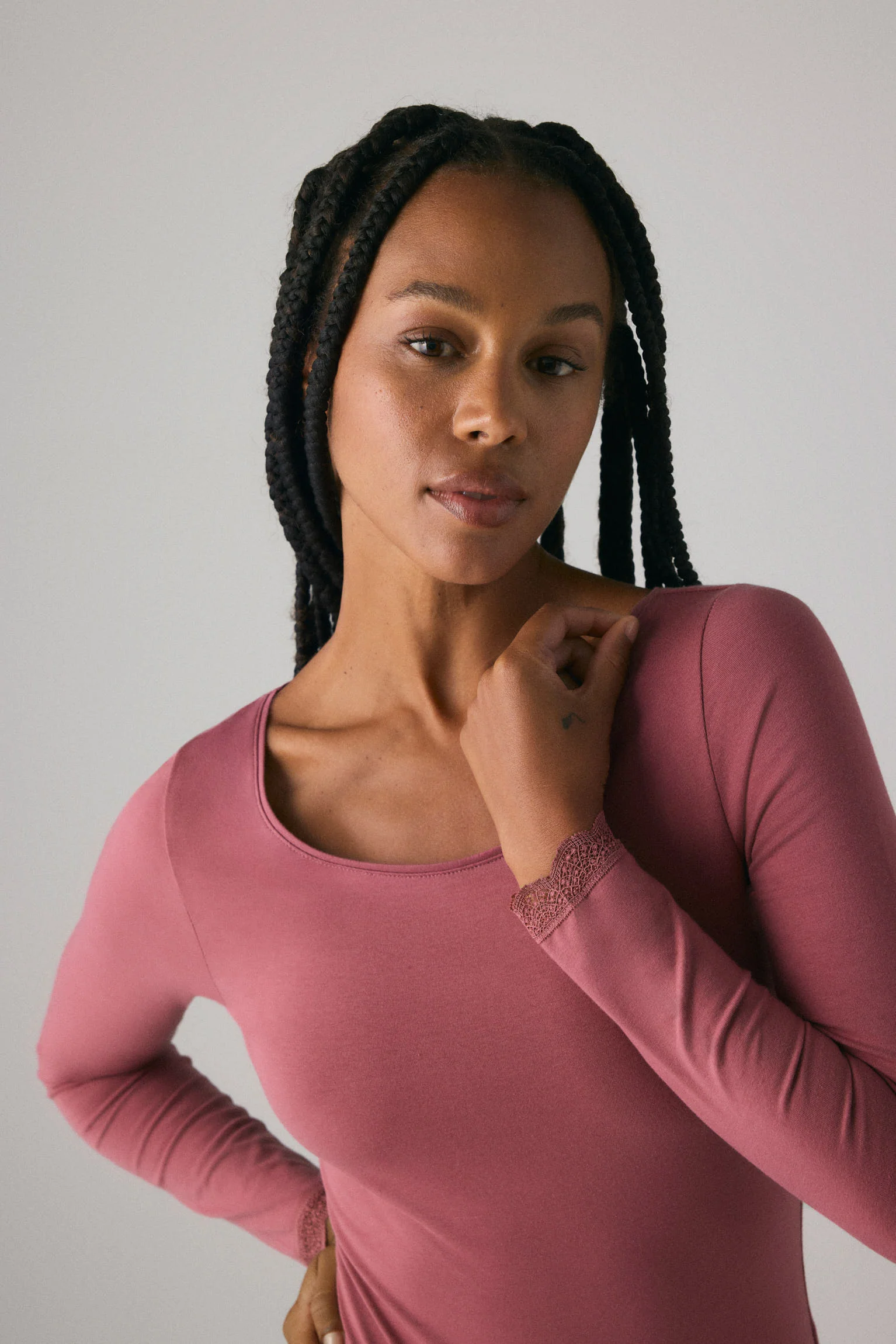 Body à revers manches longues avec dentelle rose