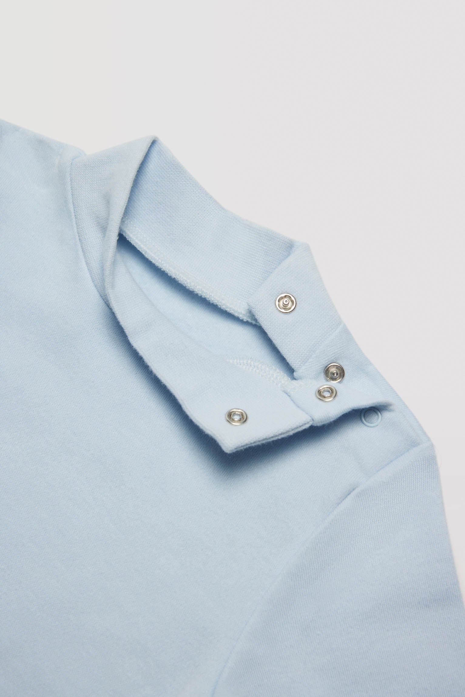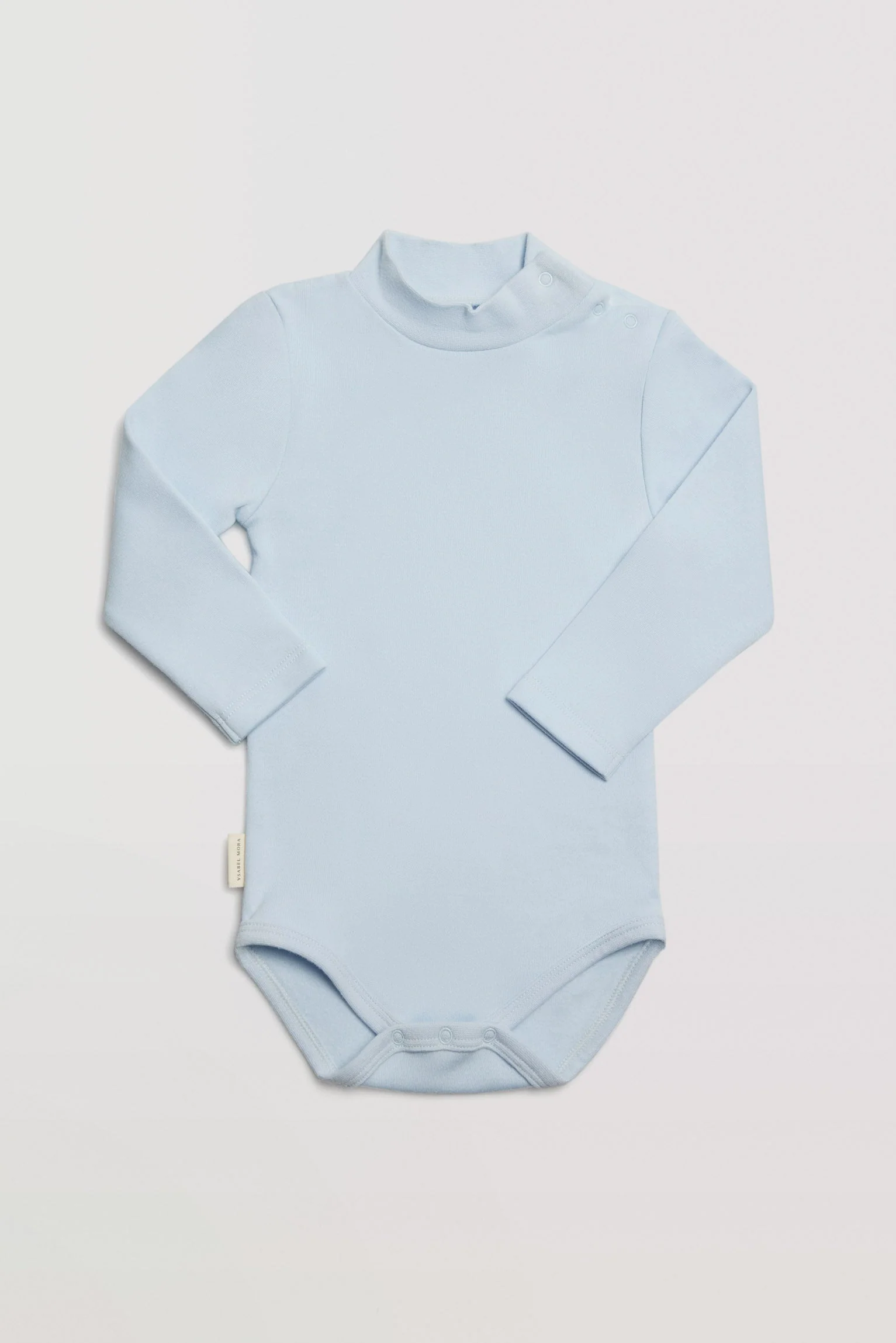 Body bébé à manches longues et col montant en coton naturel. Vêtement confectionné dans un tissu doux et agréable grâce à son intérieur moelleux. Couleur bleu clair.