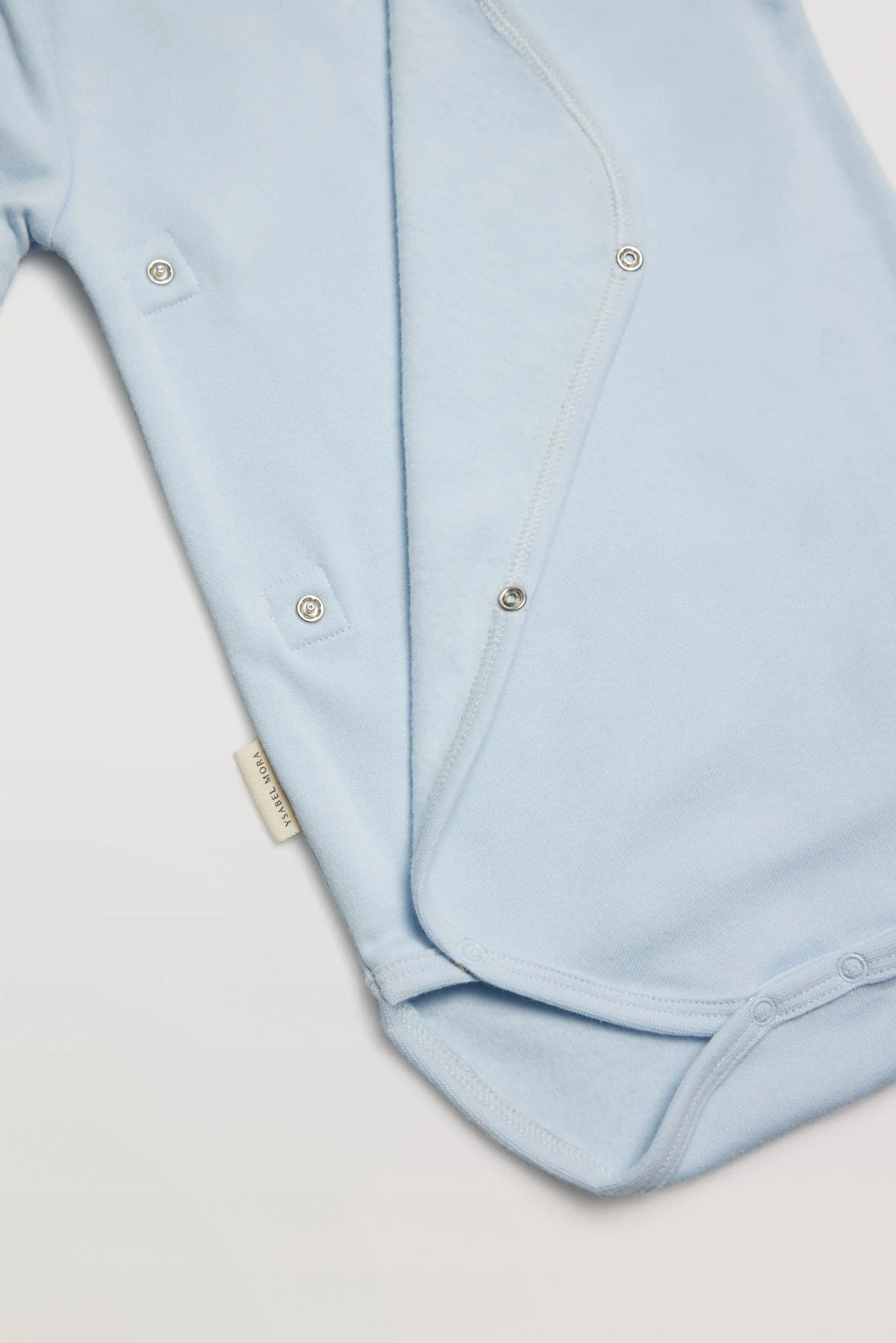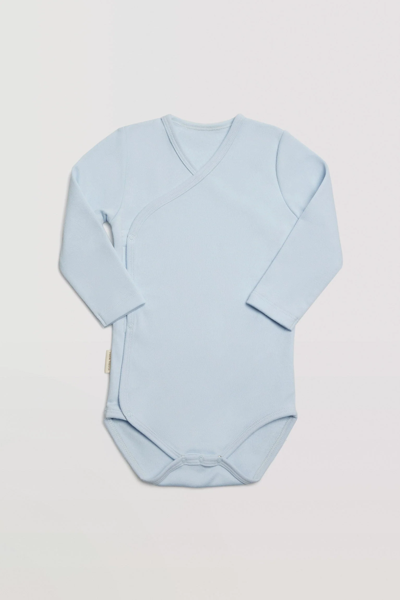 Body bébé à manches longues en coton naturel. Style croisé, avec une encolure en V. Vêtement confectionné dans un tissu doux et agréable grâce à son intérieur pelucheux. Couleur bleu clair.