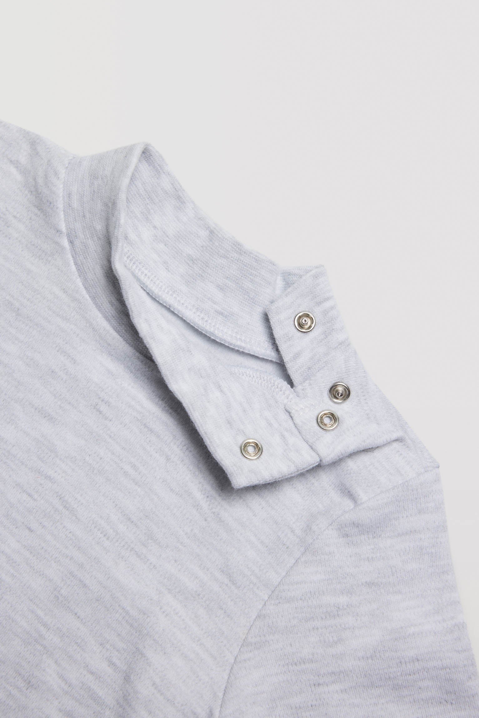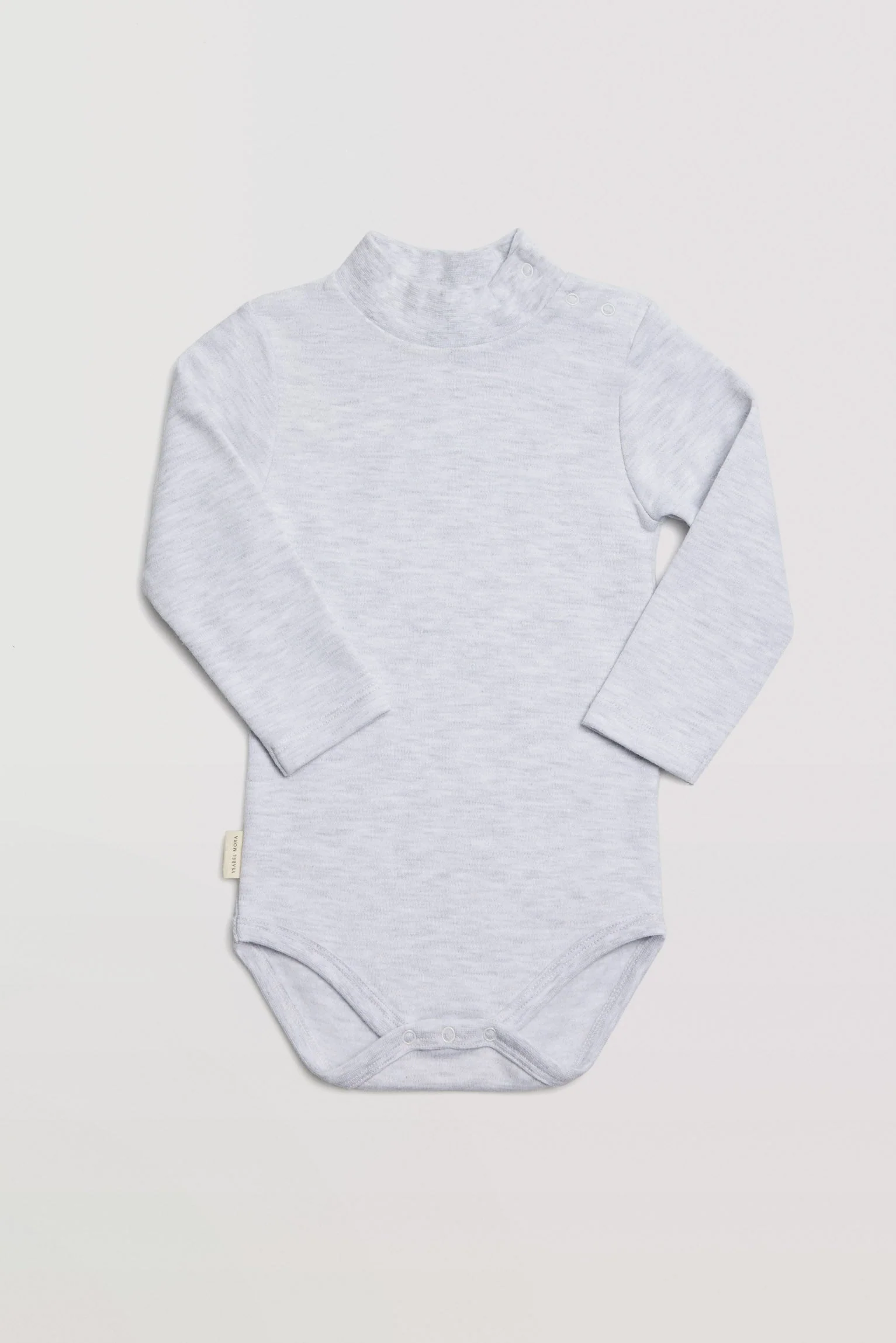 Body bébé manches longues et col montant en coton naturel. Vêtement confectionné dans un tissu doux et agréable grâce à son intérieur moelleux. Disponible en rouge, marine et gris à partir de 12 mois. Couleur gris clair.