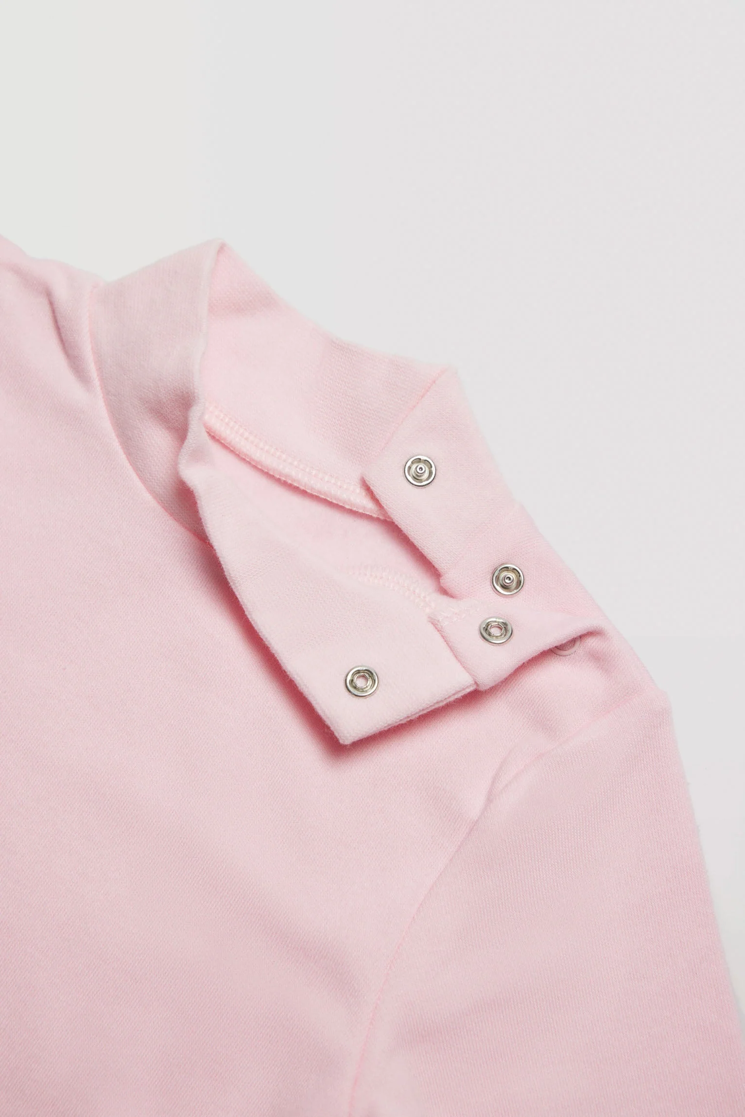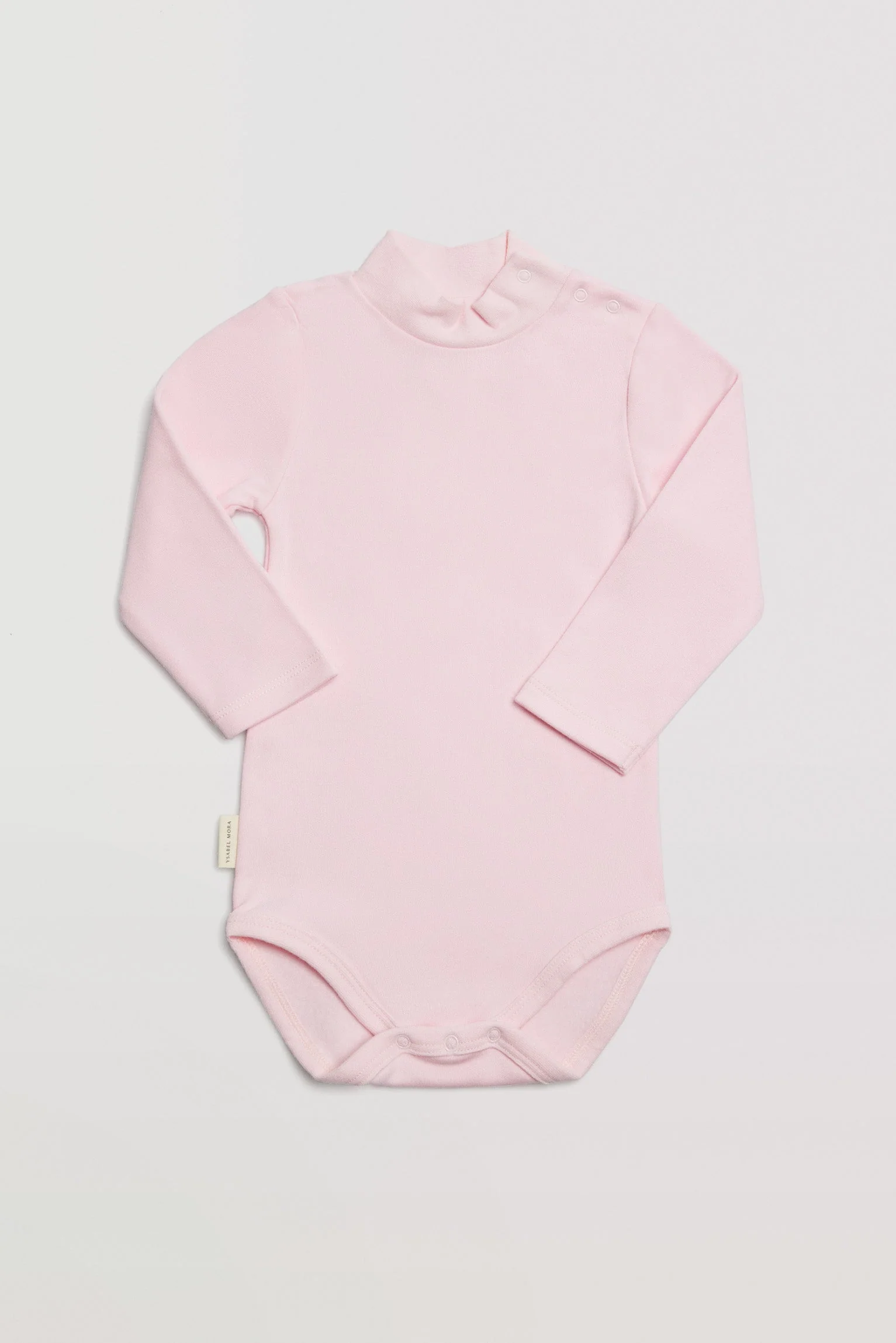 Body bébé à manches longues et col montant en coton naturel. Vêtement confectionné dans un tissu doux et agréable grâce à son intérieur moelleux. Couleur rose.