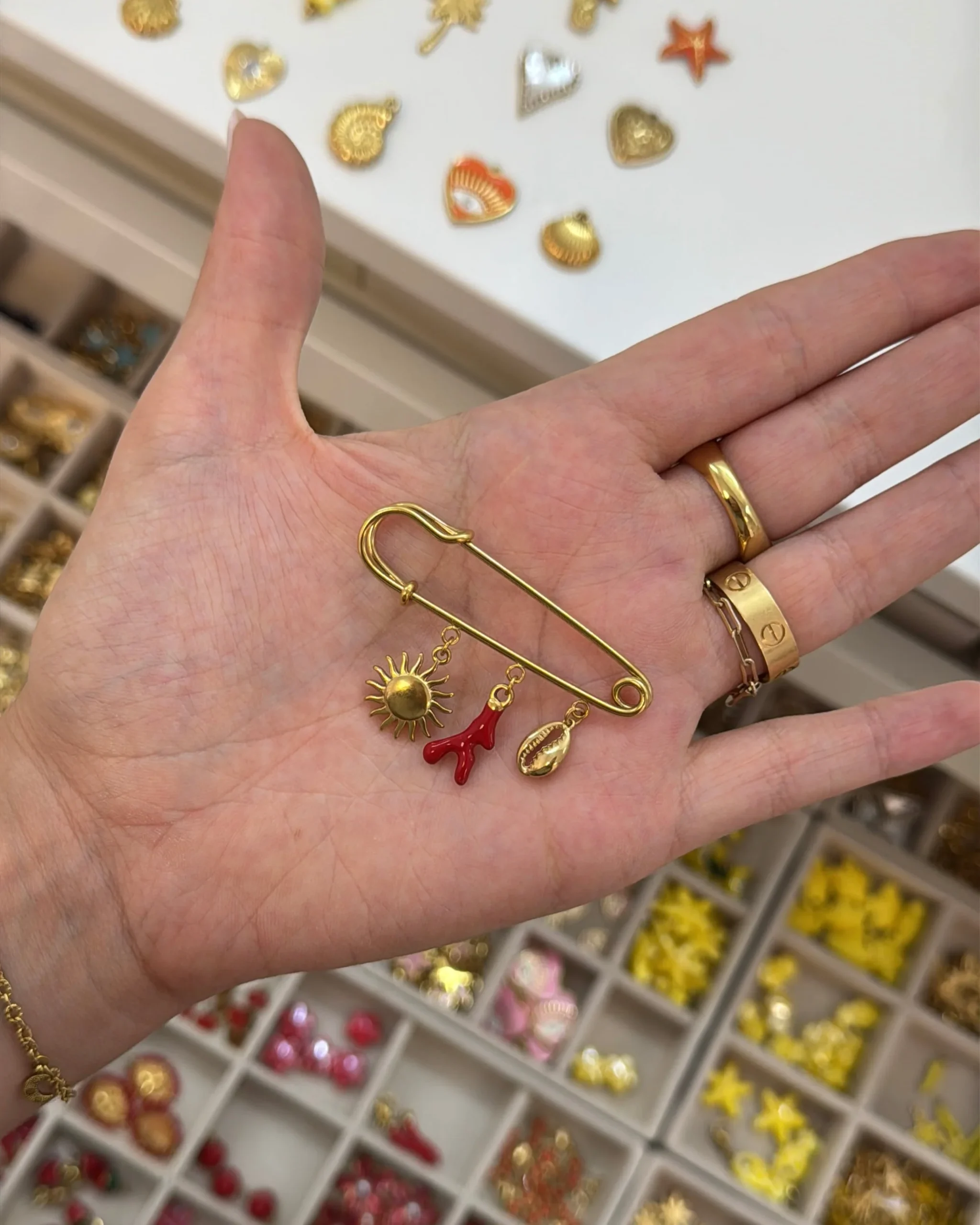 3 charms obligatoirement Matériaux : Acier inoxydable. Entièrement fabriqué à la main et à la commande. Broche à porter sur tout type de vêtement, idéal sur un blazer Les modèles présentés peuvent légèrement varier en fonction de la disponibilité chez nos fournisseurs. NB : La couleur des charms peut s’altérer avec l’eau, il vaut mieux […]