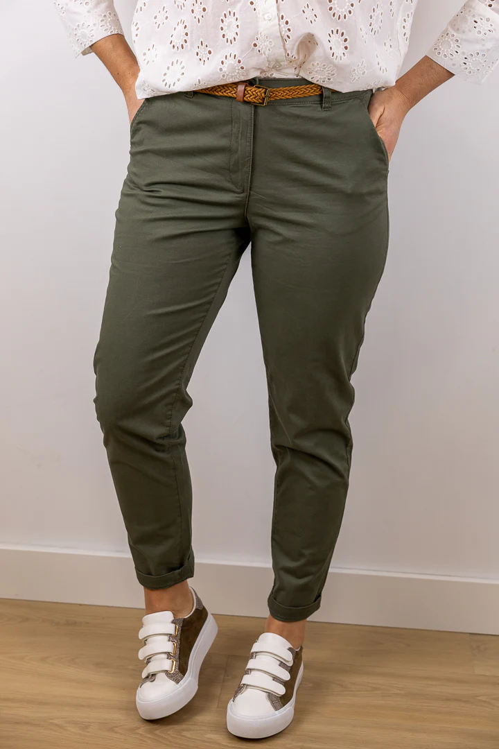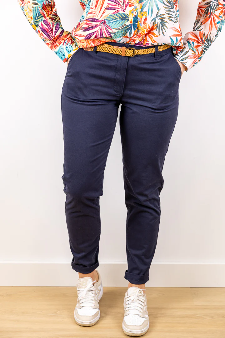 Coupe chino Bouton sur l’avant Passant pour une ceinture Ceinture amovible, vendu avec Fausses poches à l’arrière Taille haute Taille XS=34,S= 36,M= 38,L= 40,XL= 42 Le modèle mesure 1m62 est porte une taille 36 Composition : 99% coton et 2% élasthanne Prenez votre taille habituelle TRES SOUPLE HYPER CONFORTABLE