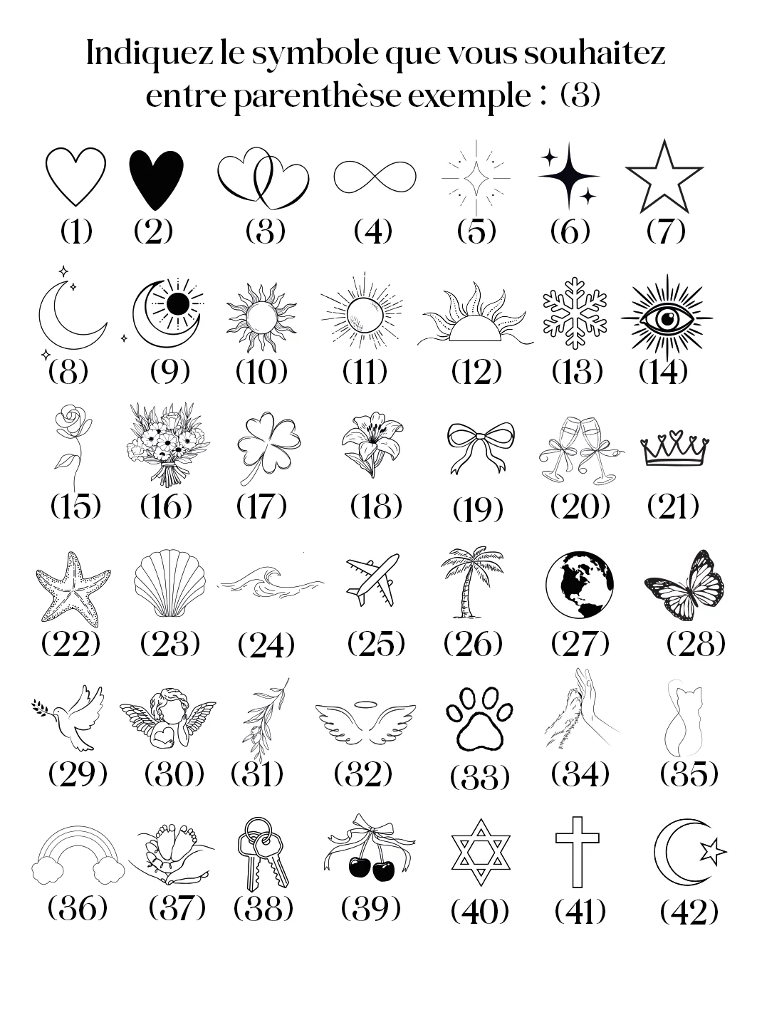 • Si vous souhaitez un symbole n’oubliez pas de le mettre entre parenthèse sinon nous graverons le chiffre indiqué