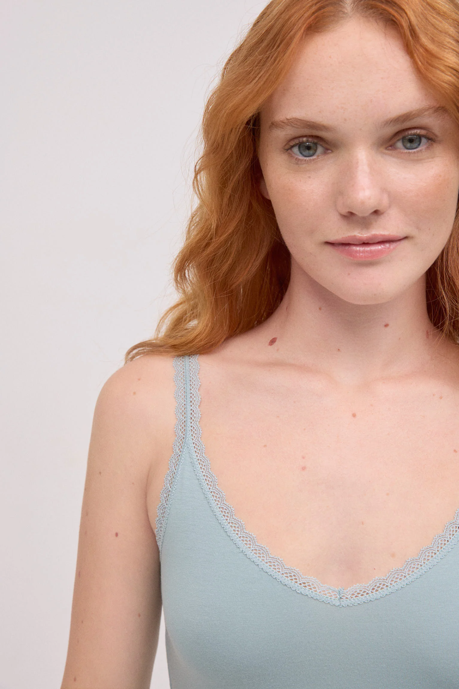 Haut à bretelles spaghetti en coton naturel, idéal pour la douceur et le confort au quotidien. Son design vert uni est orné d’un délicat passepoil à l’encolure et aux bretelles, apportant une touche féminine sans sacrifier la fonctionnalité. Idéal à porter à l’intérieur comme à l’extérieur, pour un confort absolu.