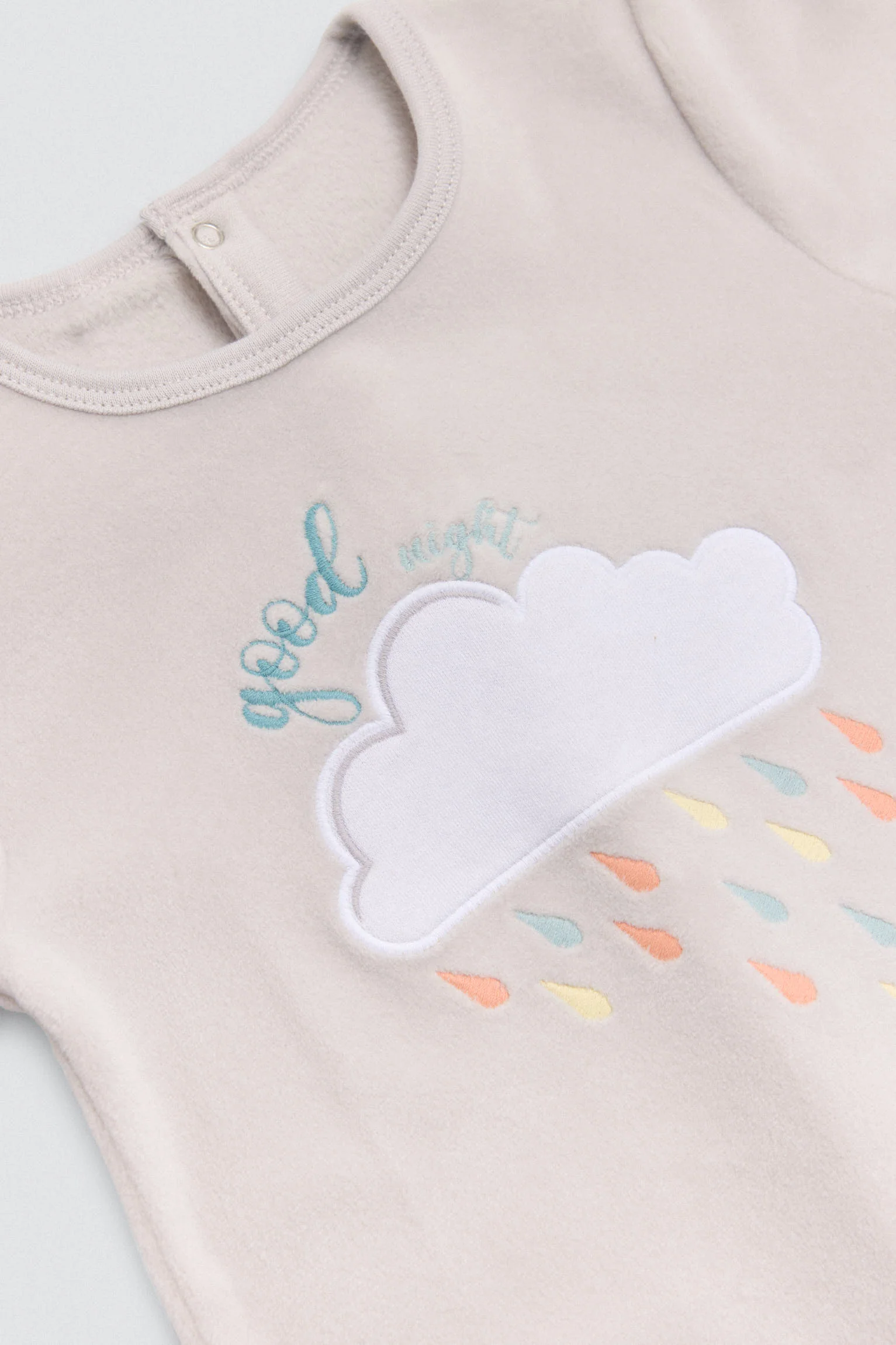Barboteuse à manches longues avec motif gouttes de pluie. Intérieur en peluche et fermeture boutonnée. Semelles antidérapantes pour une meilleure stabilité pendant les déplacements de bébé. Tissu doux et sûr. 95 % polyester, 5 % élasthanne