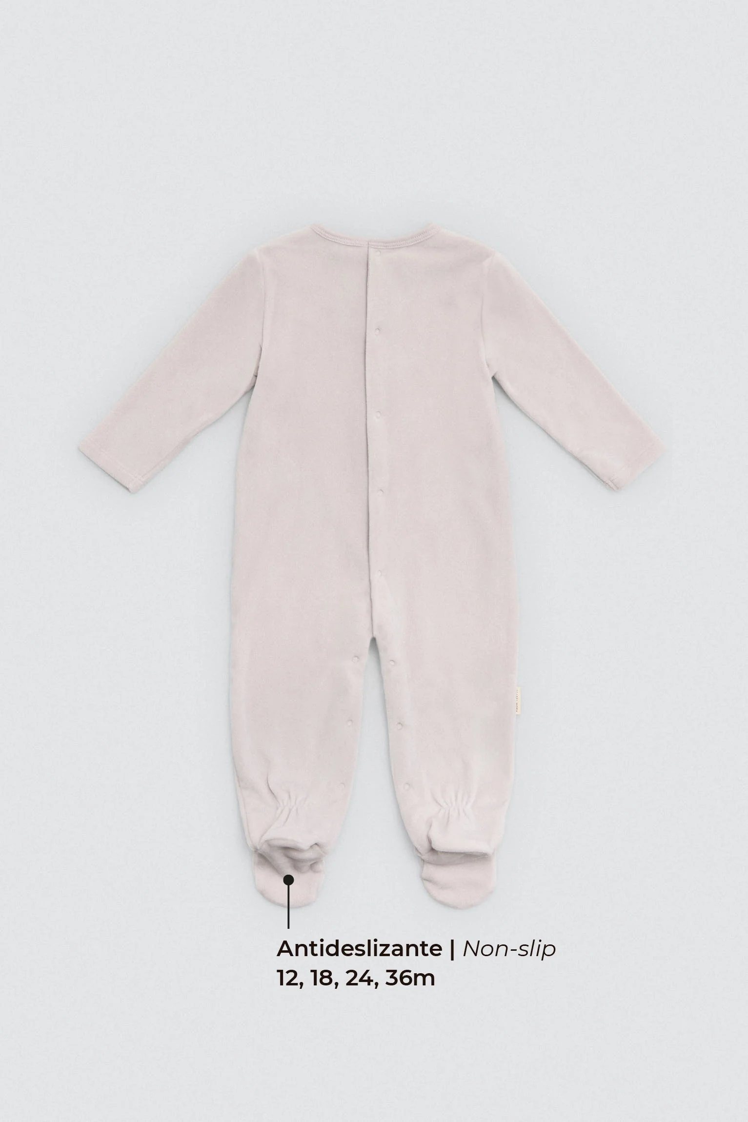 Barboteuse à manches longues avec motif gouttes de pluie. Intérieur en peluche et fermeture boutonnée. Semelles antidérapantes pour une meilleure stabilité pendant les déplacements de bébé. Tissu doux et sûr.