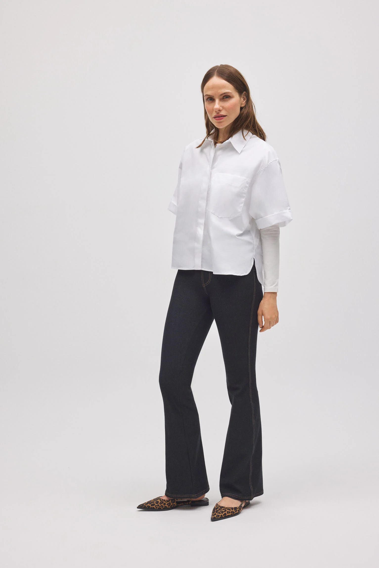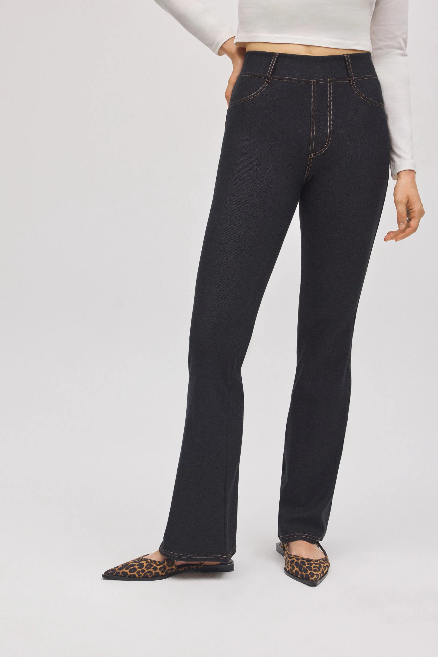 Ce jean évasé au style intemporel offre confort et une touche rétro.
