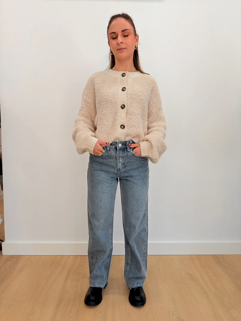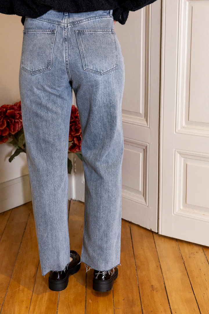 Coupe droite Effiloché sur le bas Bouton sur l’avant Passant pour une ceinture Poches à l’avant et à l’arrière Taille haute Taille XS=34,S= 36,M= 38,L= 40,XL= 42 Le modèle mesure 1m62 est porte une taille 36 Prenez votre taille habituelle Composition : 90% coton et 10% polyester