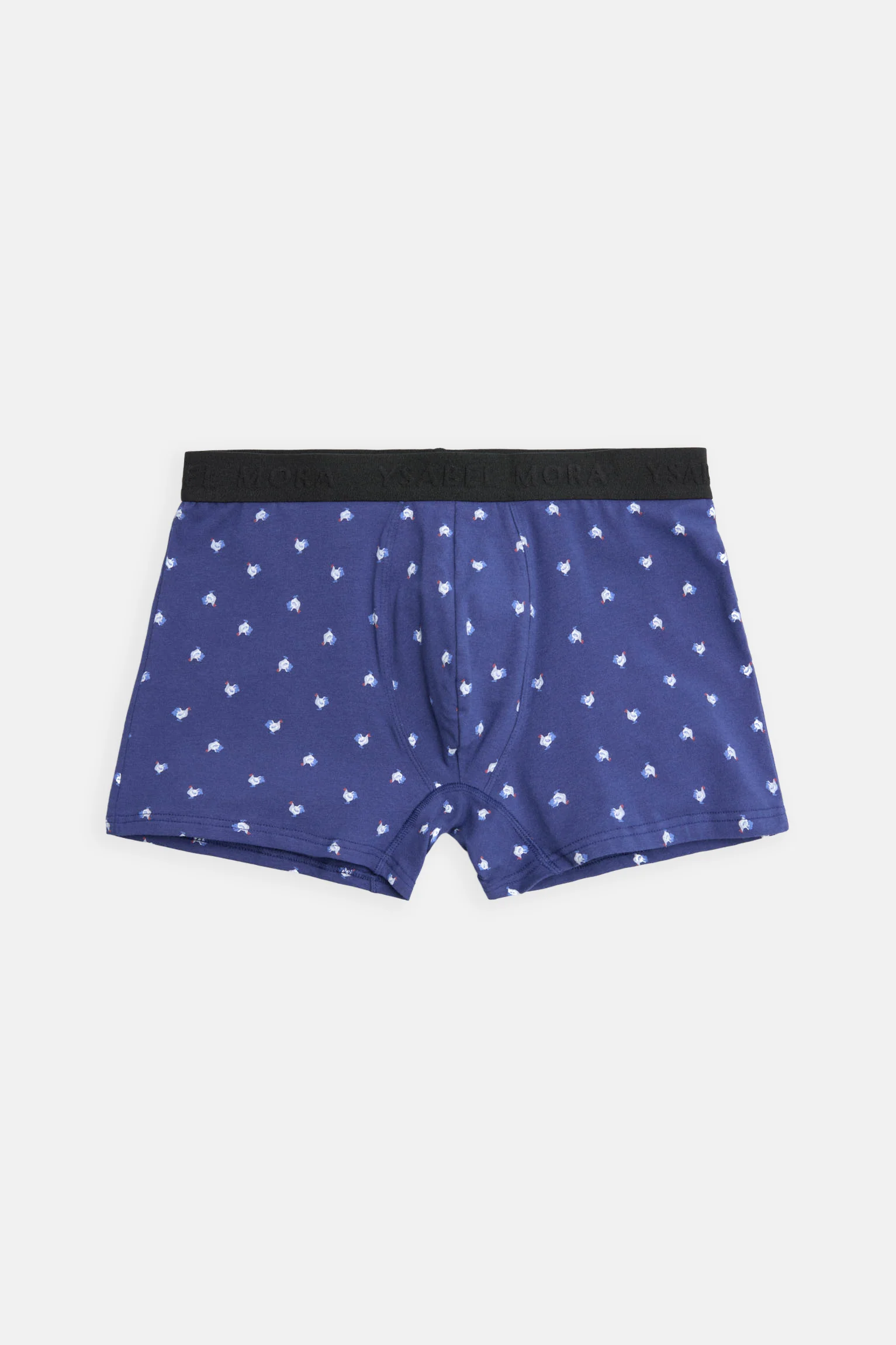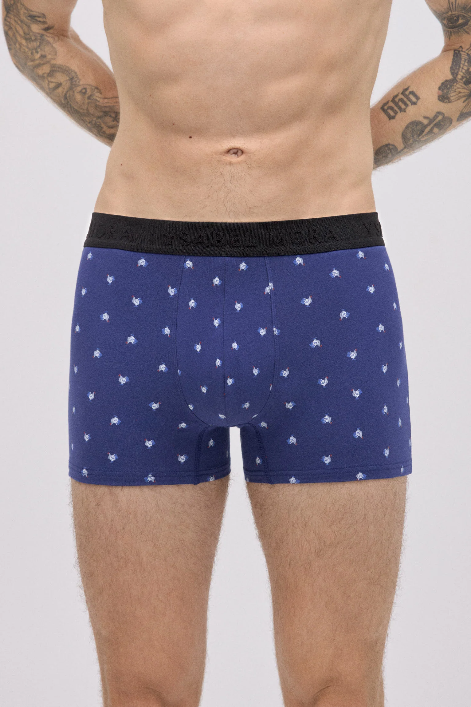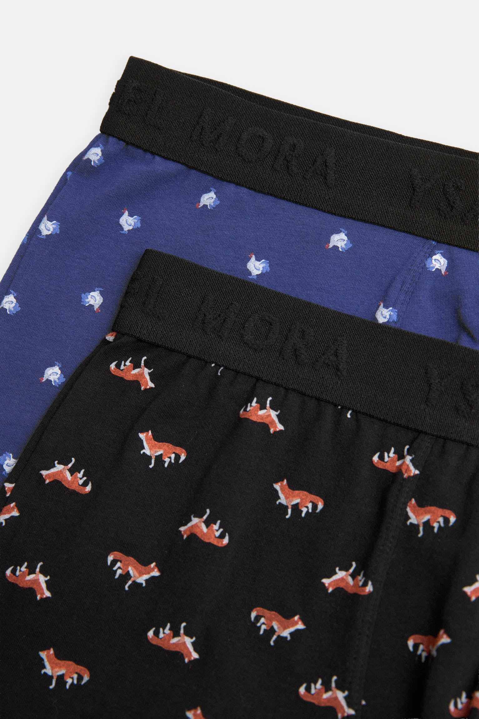 Lot de 2 boxers imprimés Ysabel Mora, en coton naturel avec une touche d’élasthanne pour un confort optimal. Chaque modèle arbore un imprimé animal différent : l’un noir avec des renards et l’autre bleu avec des coqs. La ceinture élastique noire ornée du logo de la marque offre un maintien optimal et une finition distinctive.