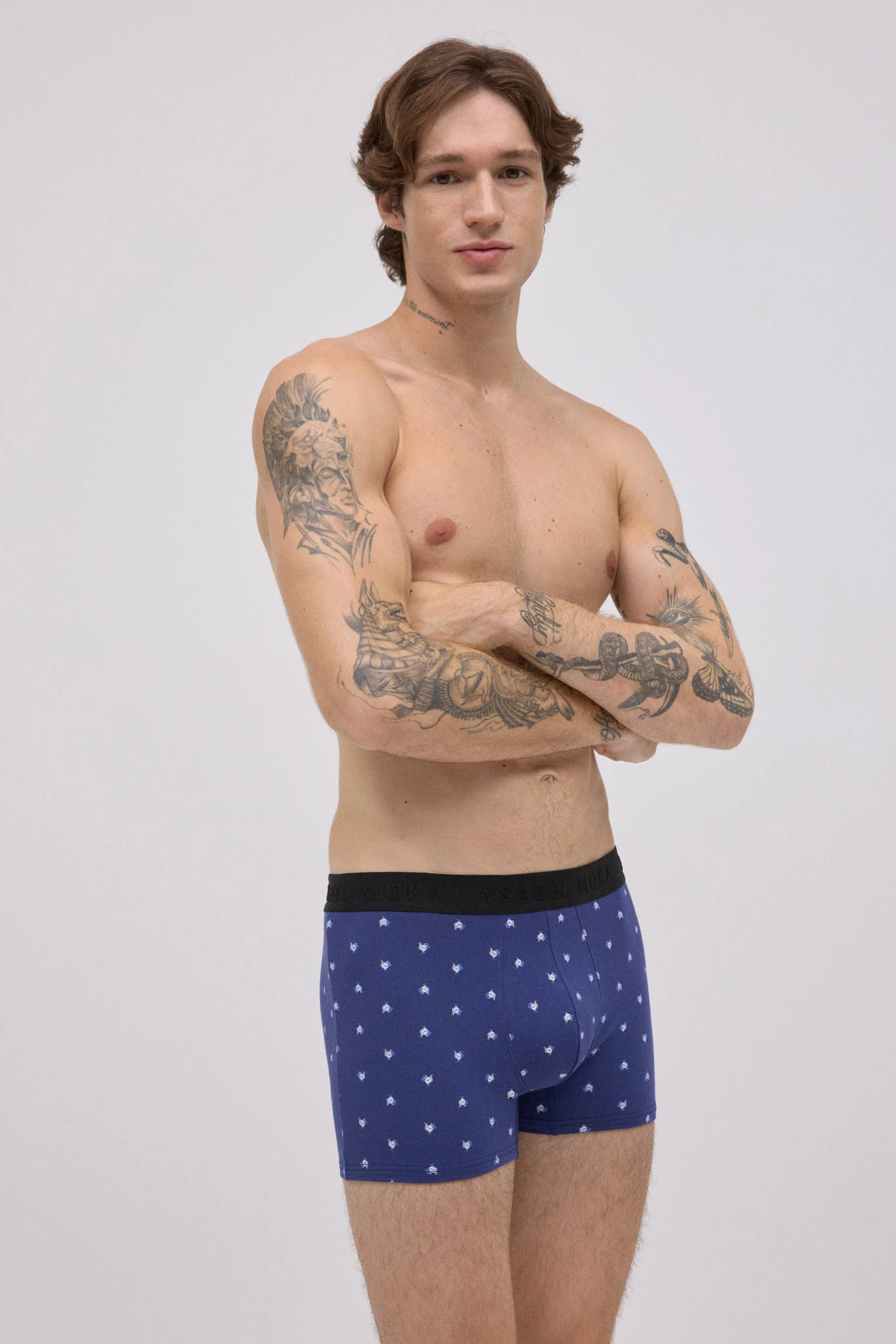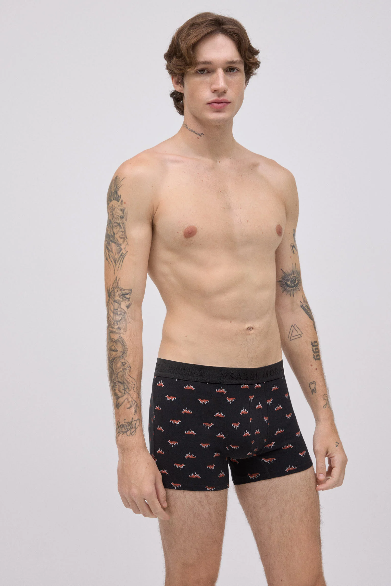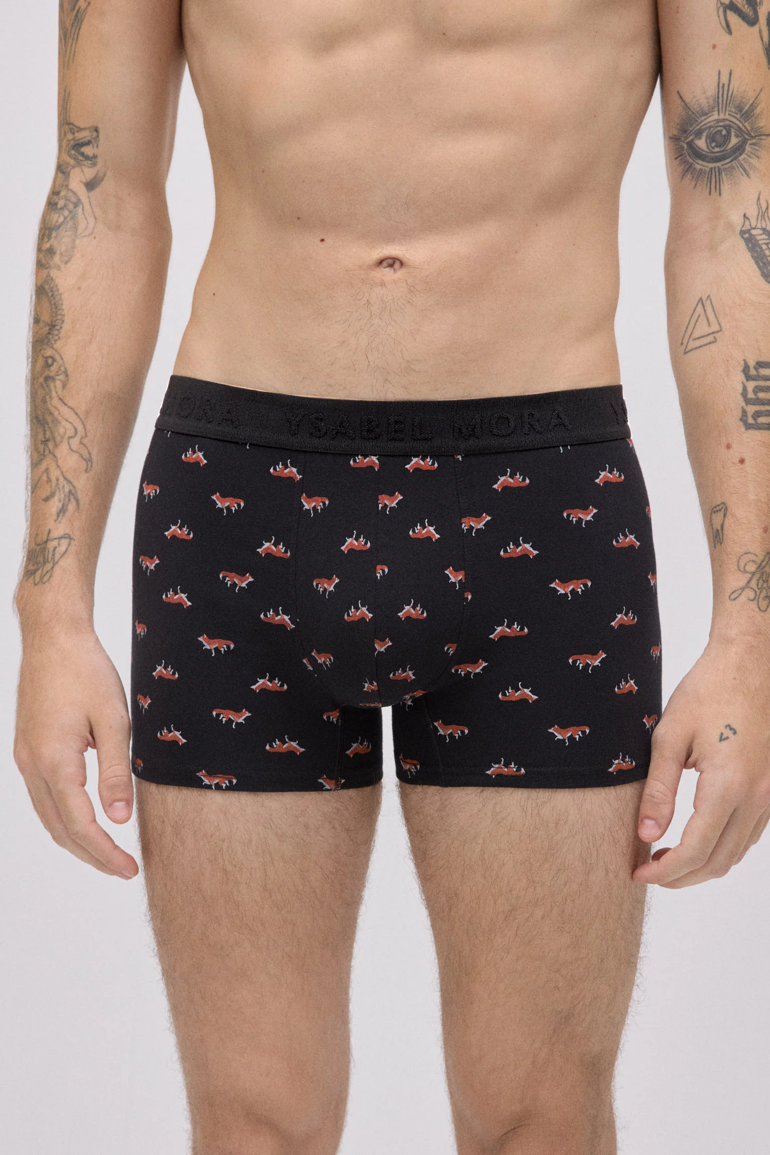 Lot de 2 boxers imprimés Ysabel Mora, en coton naturel avec une touche d’élasthanne pour un confort optimal. Chaque modèle arbore un imprimé animal différent : l’un noir avec des renards et l’autre bleu avec des coqs. La ceinture élastique noire ornée du logo de la marque offre un maintien optimal et une finition distinctive.