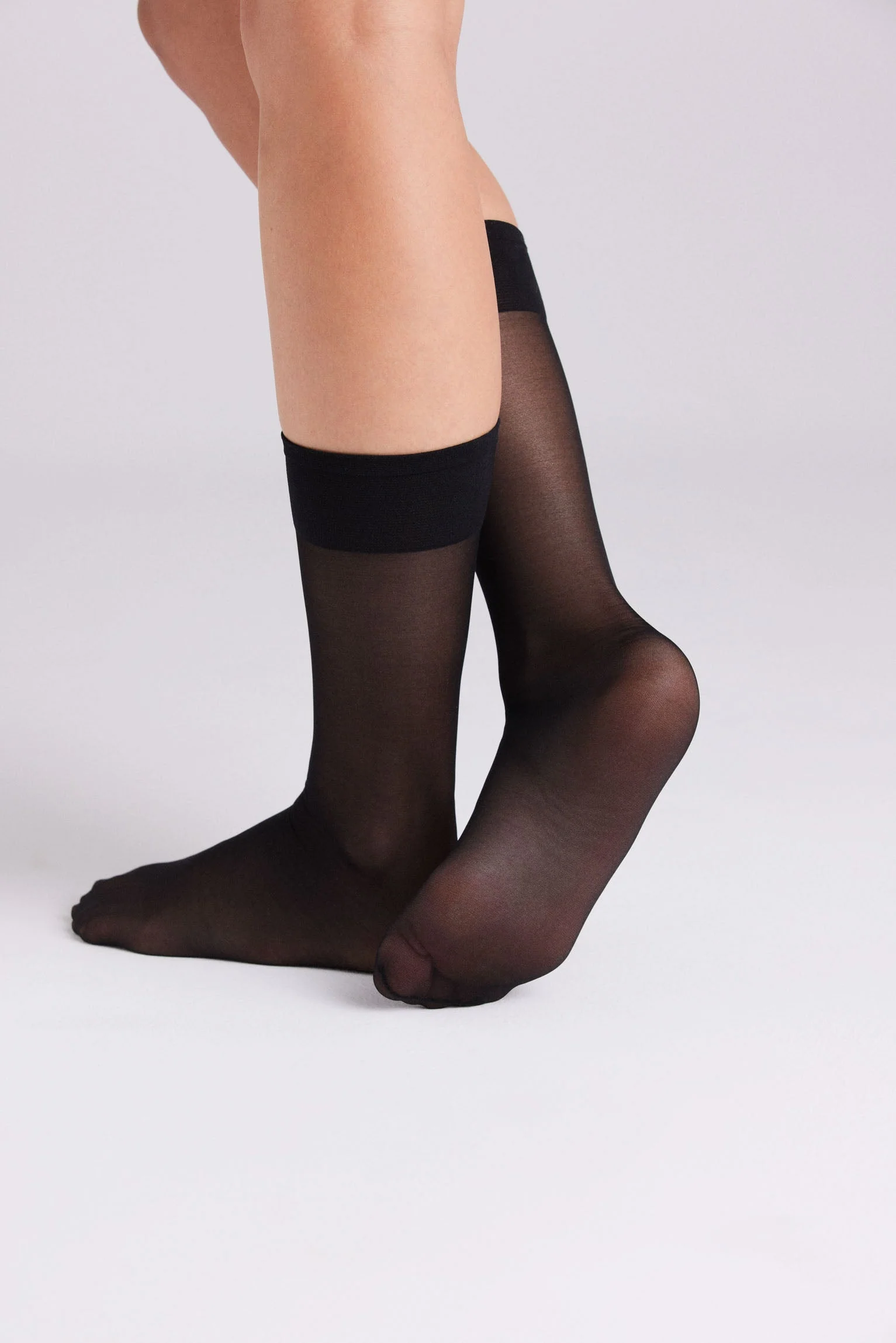 Mini bas 15 DEN. Manchette anti-pression et pointe invisible, confort et invisibilité. Ça ne tombe pas, ça n’appuie pas.