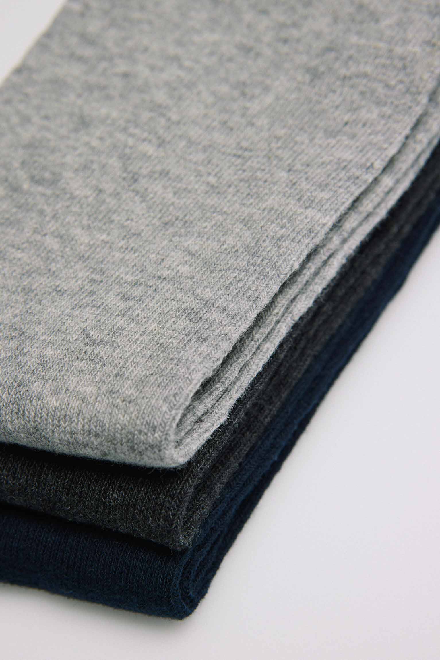 Pack de 3 paires de chaussettes pour femme. Fabriqué en coton et sans manchette anti-pression. Confort au quotidien. Comprend une paire de chaque couleur : bleu marine, gris anthracite et gris clair. 80 % coton, 17 polyester, 3 % élasthanne