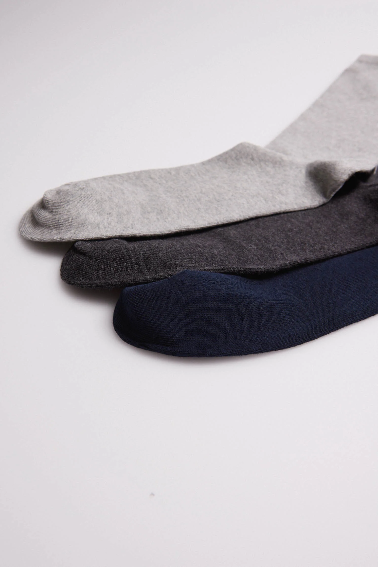 Pack de 3 paires de chaussettes femme dans les tons foncés. Comprend une paire de chaussettes bleu marine, une paire gris anthracite et une paire gris clair. Fabriqué en coton et doté d’un revers anti-pression pour garantir une agréable sensation de bien-être. Confort au quotidien.