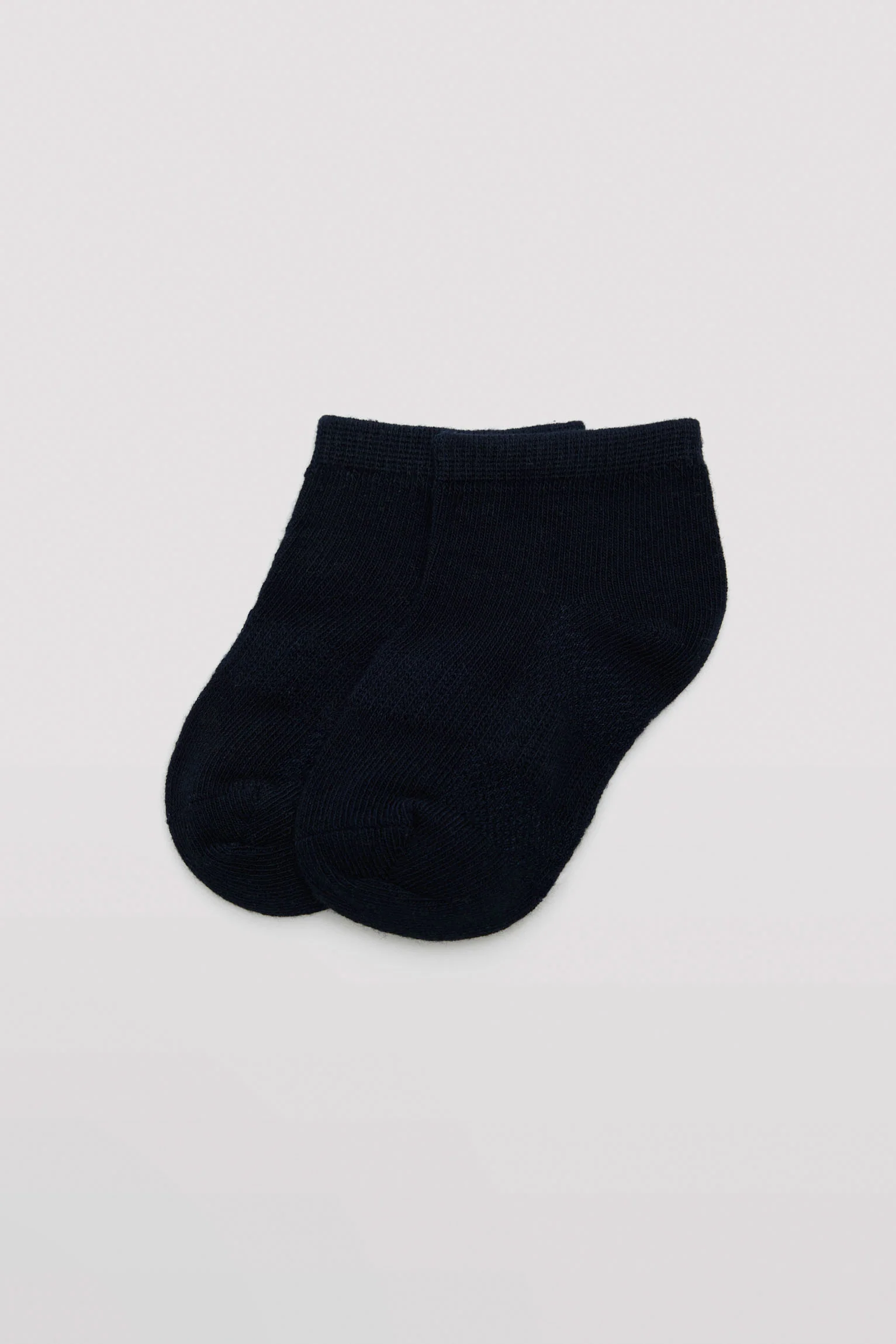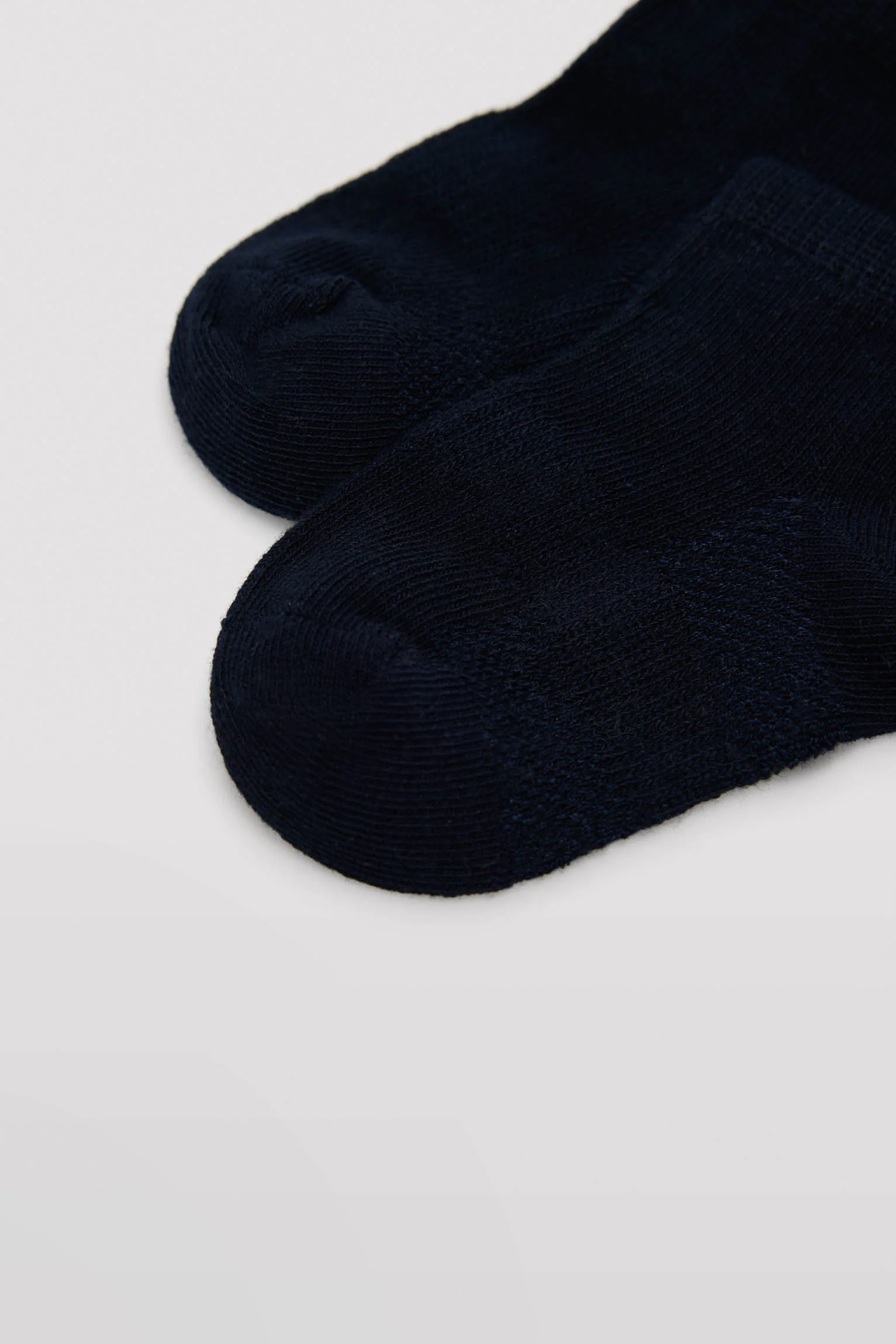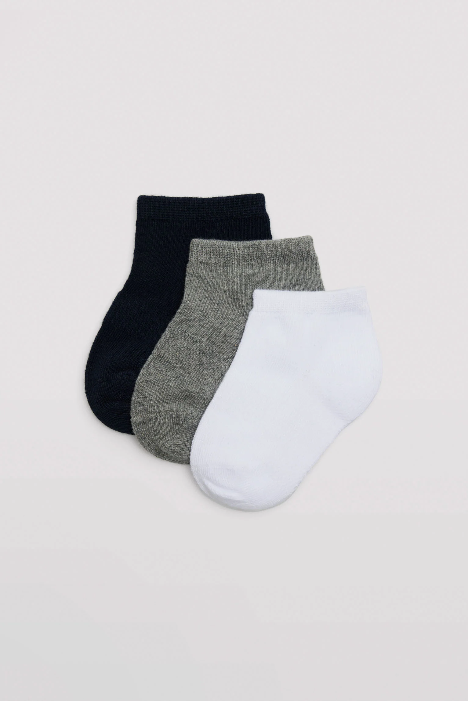 Lot de 3 chaussettes bébé basiques respirantes de style sport. Comprend un de chaque couleur : bleu marine, gris et noir