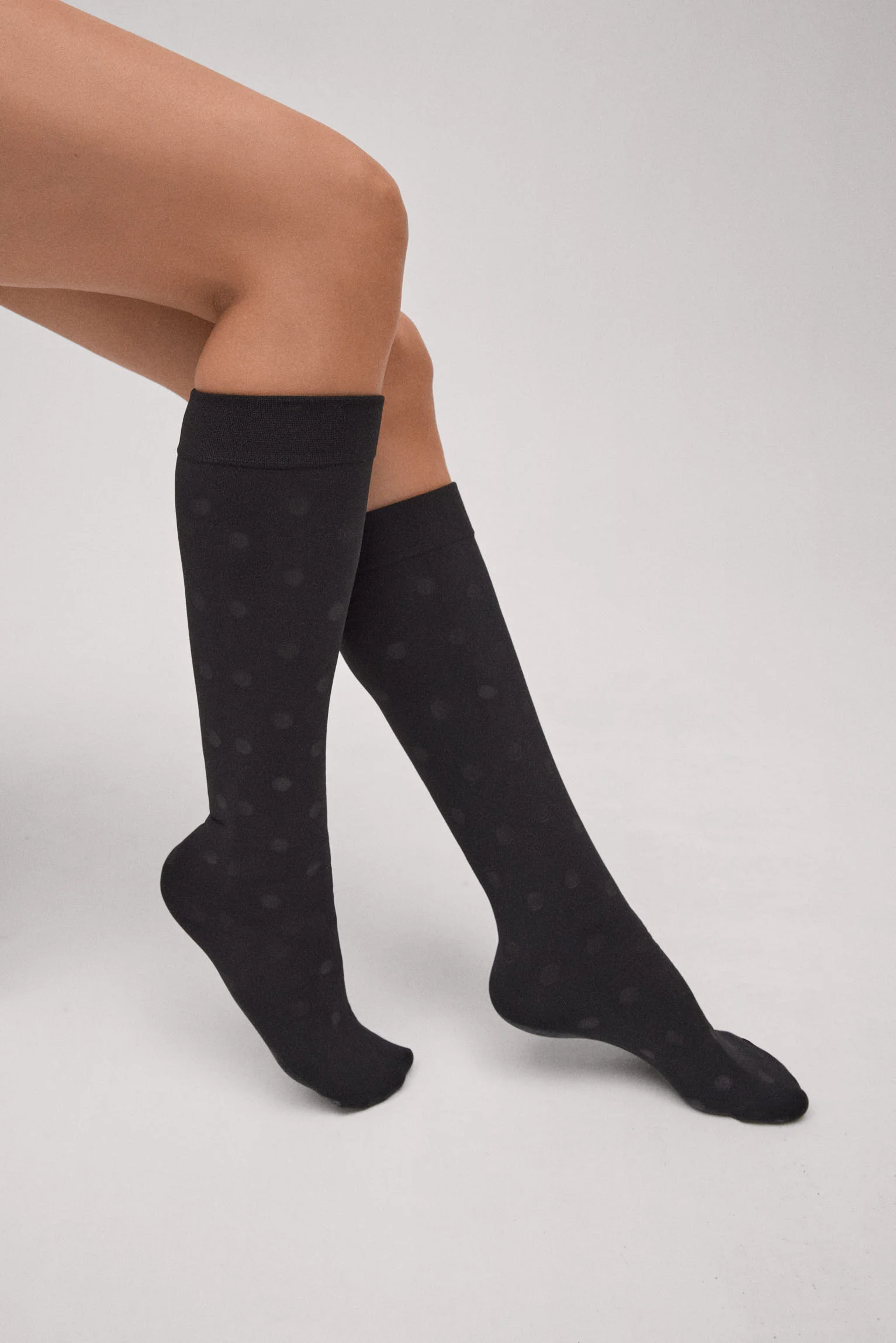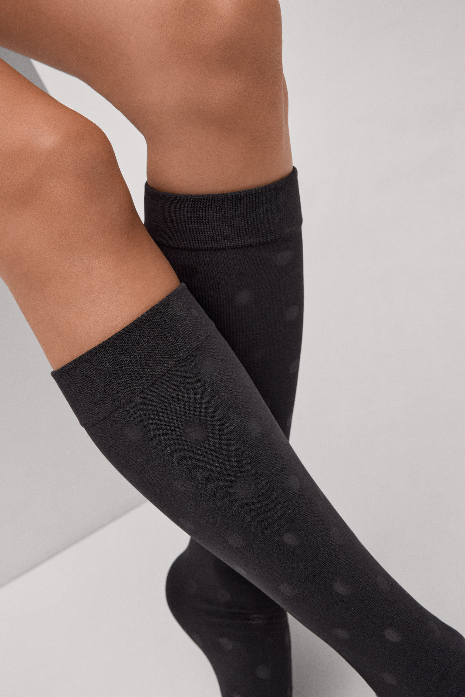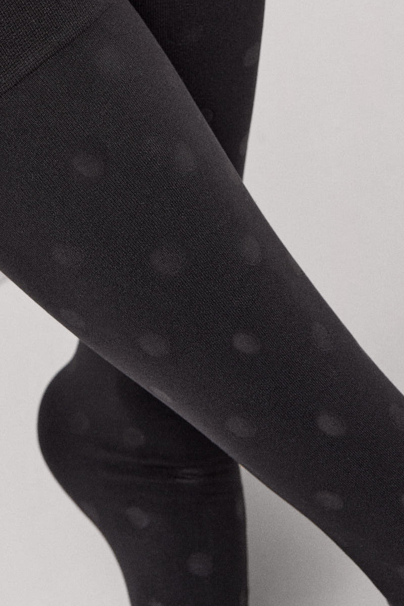 Mini bas thermique imprimé à pois 140 deniers. 95 % polyester, 5 % élasthanne