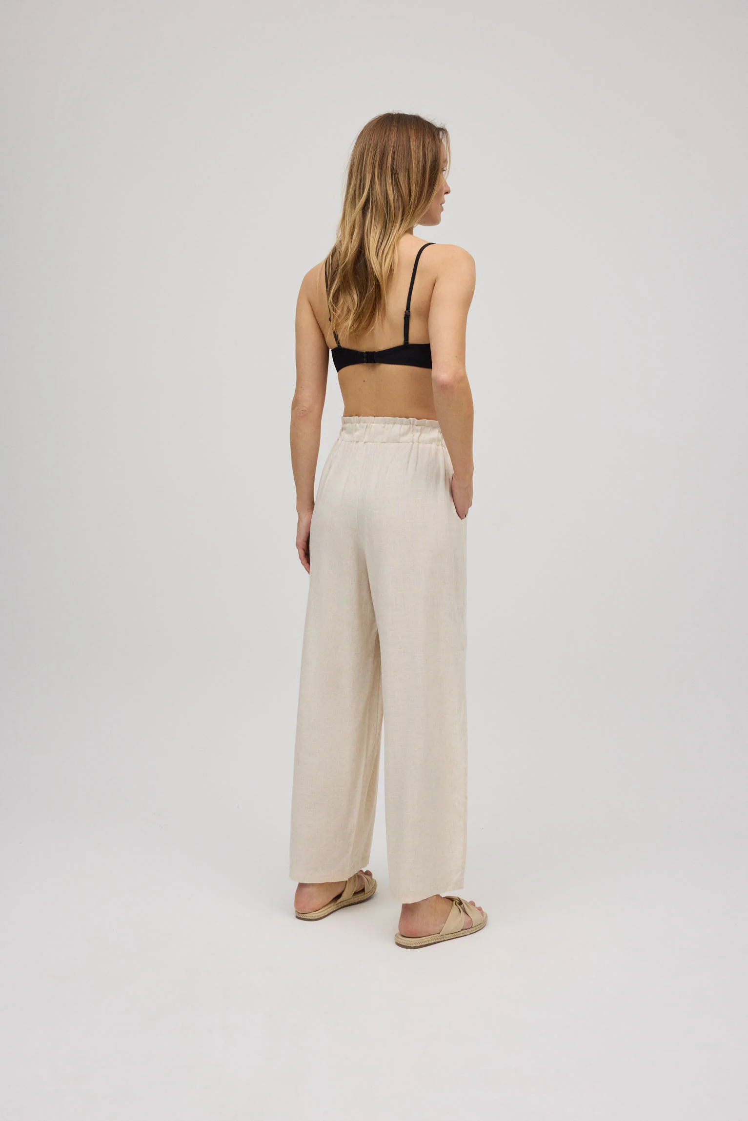 Pantalon long en lin. Taille serrée pour une silhouette élégante et stylisée. Fond fluide avec ouvertures latérales lui apportant une touche estivale. Associez-le à un haut de la collection pour compléter le look.