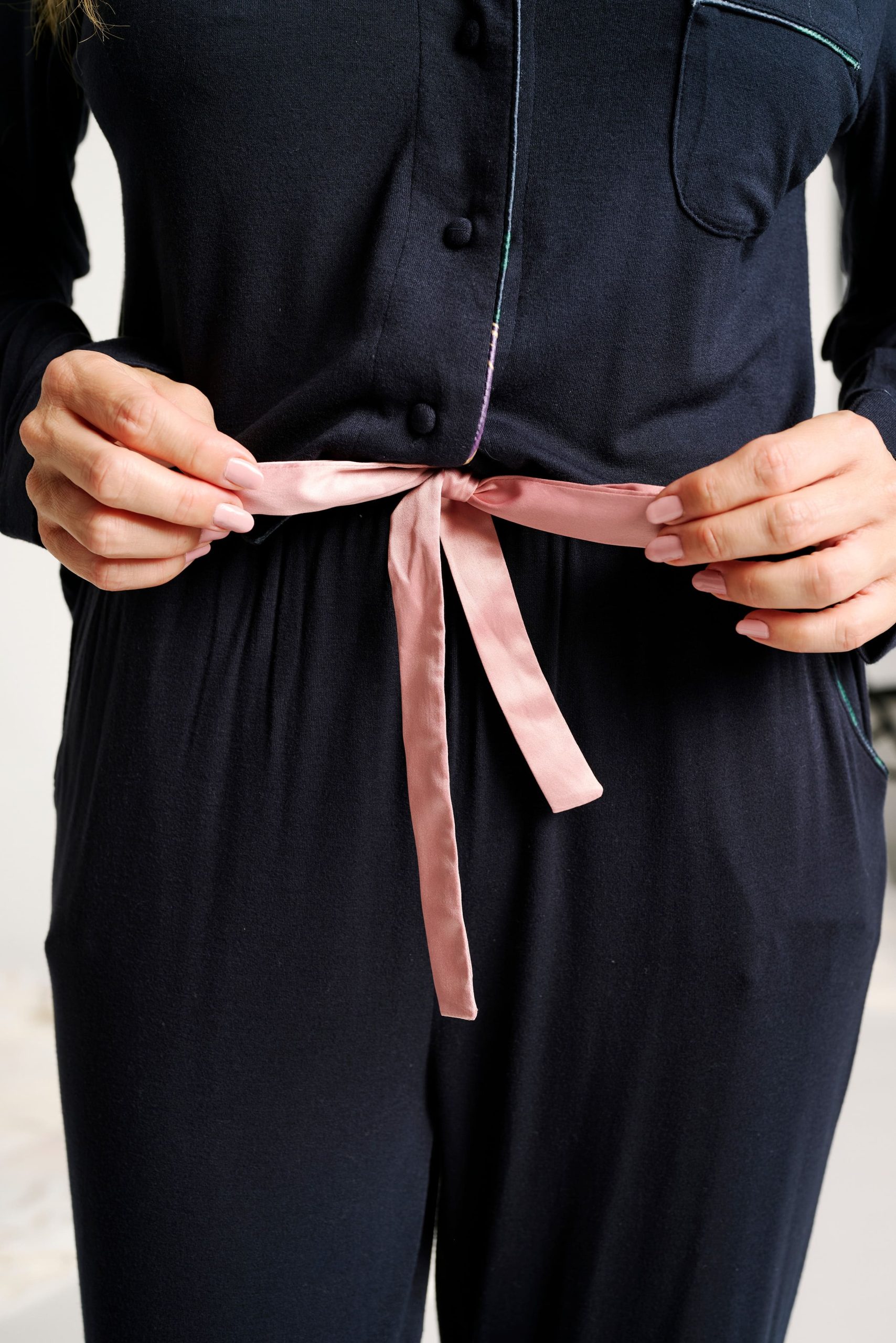 Pyjama femme noir de style classique, composé d’une chemise à manches longues boutonnée sur le devant et d’une poche poitrine, et d’un pantalon assorti. Confectionné dans un tissu doux et confortable, il est idéal pour des nuits chaudes et relaxantes, avec une touche d’élégance. 95 % viscose, 5 % élasthanne. MUYDEMI est une marque reconnue dans le monde du textile. Elle a réinventé le homewear avec des créations uniques, conçues pour celles qui recherchent la qualité, le confort et une touche d’originalité dans chaque vêtement.