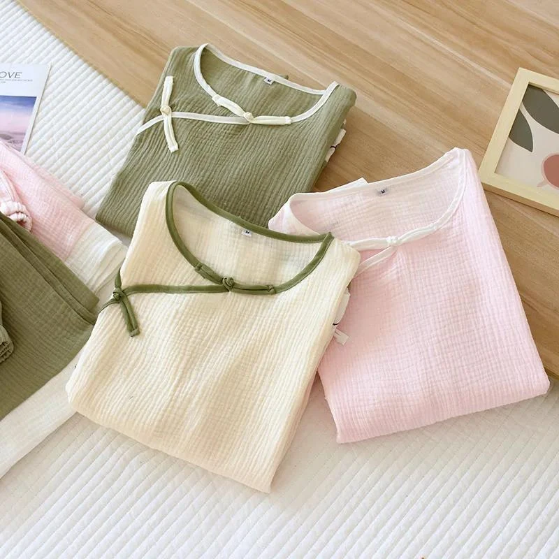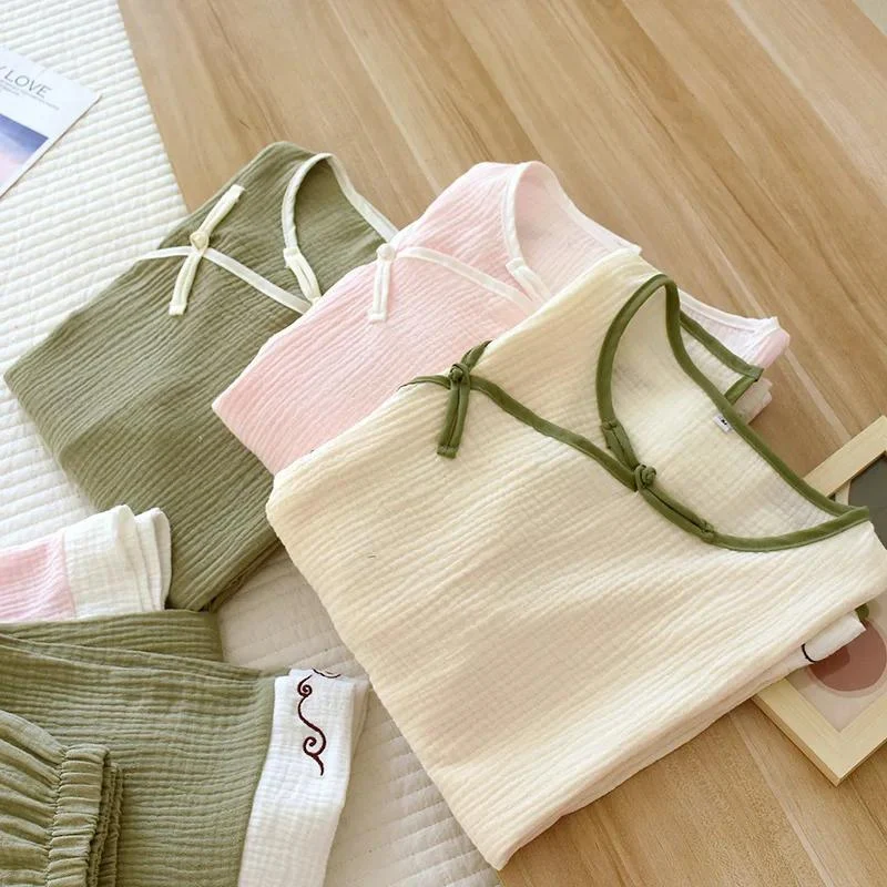 Le haut à manches longues possède un col rond avec des détails verts, ainsi qu’un nœud traditionnel sur le côté, ajoutant une jolie touche de style à l’ensemble. Le pantalon assorti, avec sa taille élastique, garantit un ajustement confortable et une facilité de mouvement.