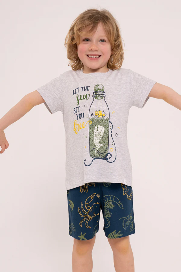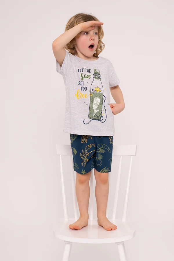 Ensemble pyjama enfant pour garçon composé d’un t-shirt à manches courtes et d’un short au design inspiré de la mer. T-shirt graphique gris avec message « Let the Sea Set you free ». Pantalon imprimé qui s’adapte au corps grâce à une bande élastique. Tissu frais et léger. Disponible en tailles hommes et enfants.