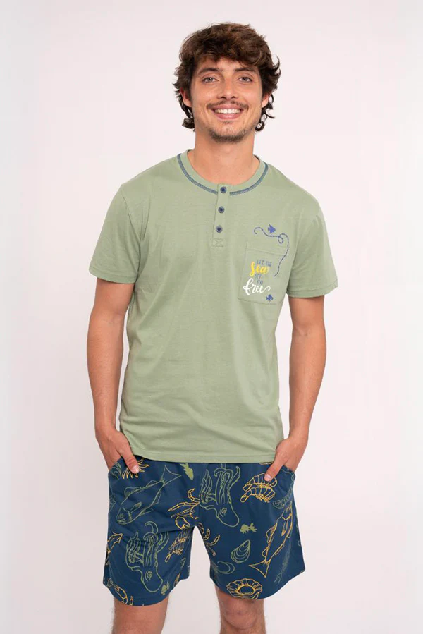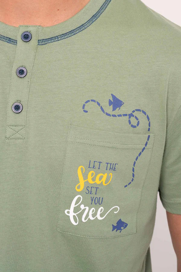 Ensemble pyjama d’été composé d’un t-shirt à manches courtes et d’un short. Fabriqué en coton. Tissu léger, frais et respirant. T-shirt vert à message, boutonné au col et coupe longue. Short avec cordon réglable et poches latérales. Impression inspirée de la mer.