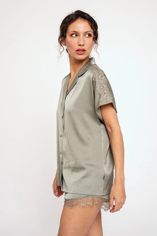 Ensemble pyjama en satin vert, composé d’une chemise boutonnée à manches courtes et d’un short. Cet ensemble élégant est orné de détails en dentelle, apportant une touche sophistiquée et féminine. Le pantalon comprend une bande à nouer pour un ajustement parfait.