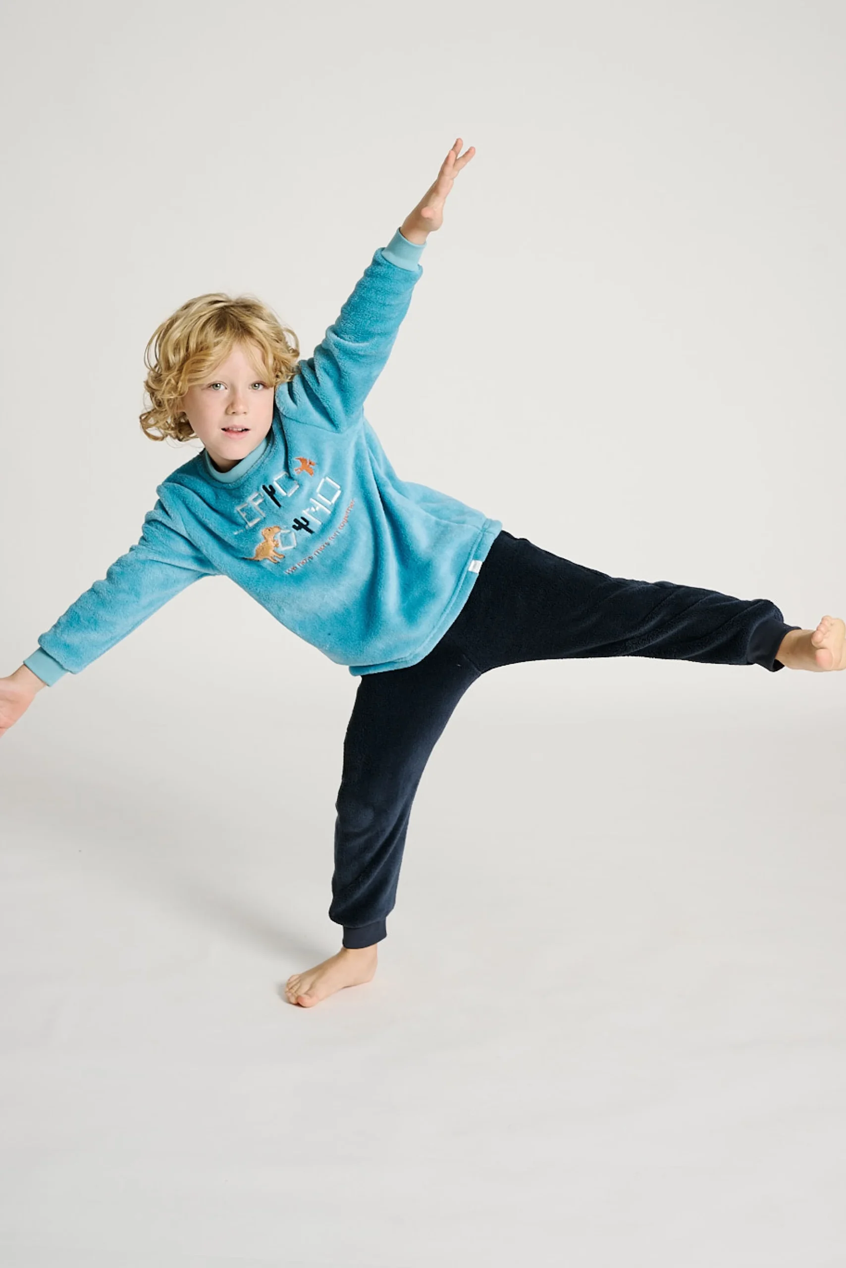 Pyjama deux pièces pour enfant en polaire douce pour plus de chaleur et de confort. Le haut bleu turquoise arbore un motif avec des illustrations et des textes inspirés des dinosaures, tandis que le pantalon bleu marine offre un élégant contraste. Un ensemble chaud, idéal pour les journées froides, alliant style et confort pour les plus petits.