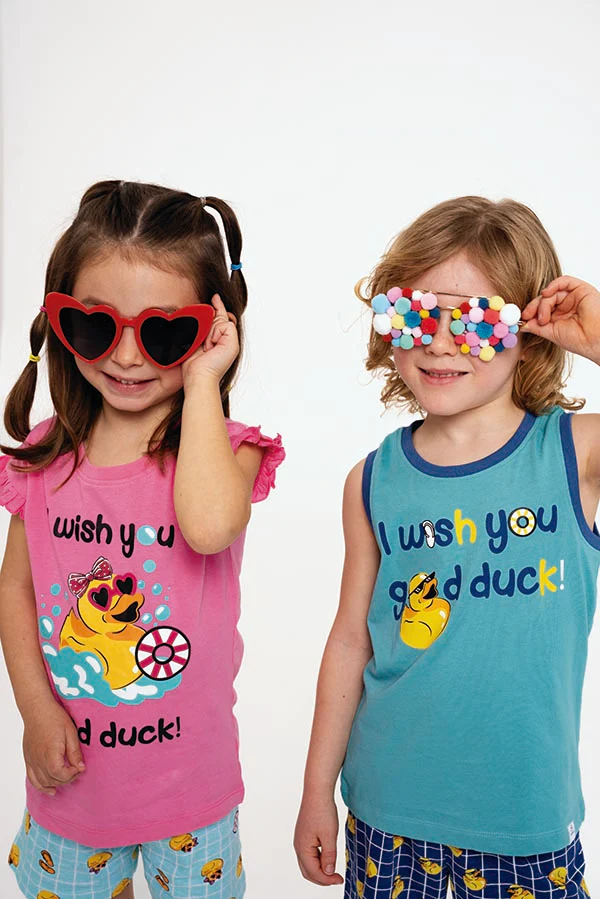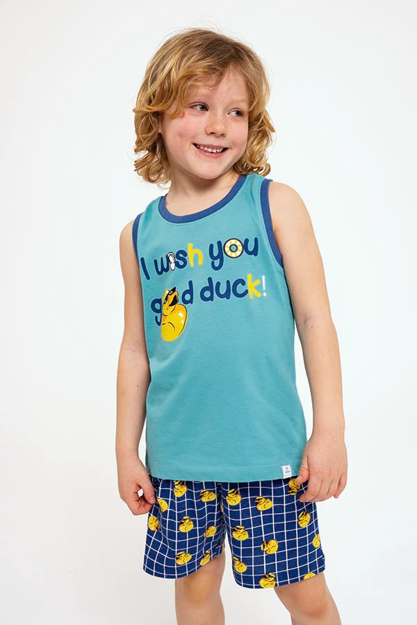 Ensemble pyjama enfant pour garçon composé d’un t-shirt à larges bretelles et d’un short. Impression amusante avec le message « Je te souhaite un bon canard ! » sur le tee-shirt. Pantalon avec élastique. Tissu frais et léger. Design également disponible pour les filles en rose. Une collection pour toute la famille !