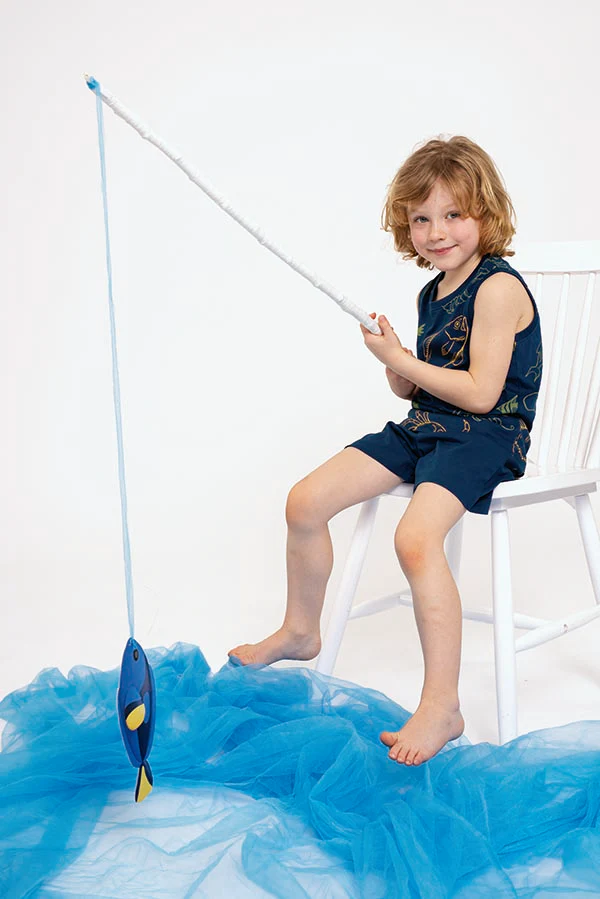 Ensemble pyjama enfant avec imprimé poisson. T-shirt à larges bretelles. Short imprimé avec élastique qui s’adapte à la taille. Impression également disponible pour les adultes.