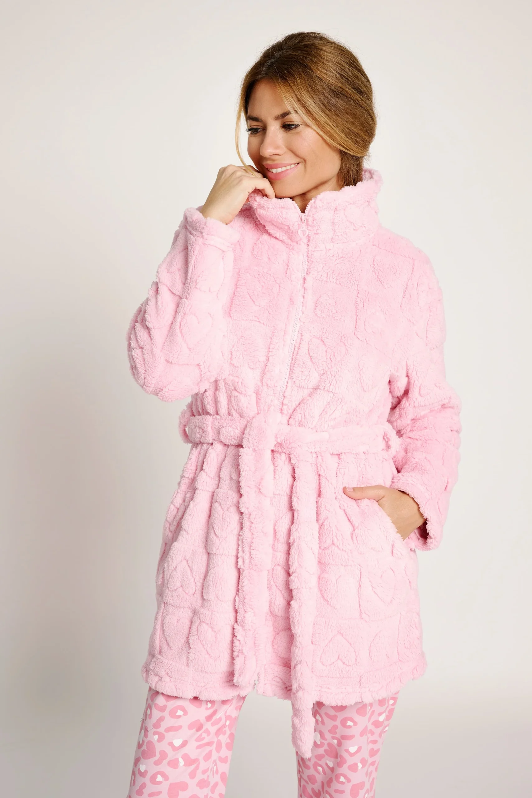 Peignoir court en polaire ultra douce à imprimé cœur. Fermeture zippée et ceinture réglable pour plus de confort. Col montant pour plus de chaleur et poches latérales pratiques. Un modèle chaud et féminin, idéal pour la maison par temps froid. 100 % polyester. MUYDEMI est une marque reconnue dans le monde du textile. Elle a réinventé le monde du homewear avec des créations uniques, conçues pour celles qui recherchent qualité, confort et une touche d’originalité dans chaque vêtement.