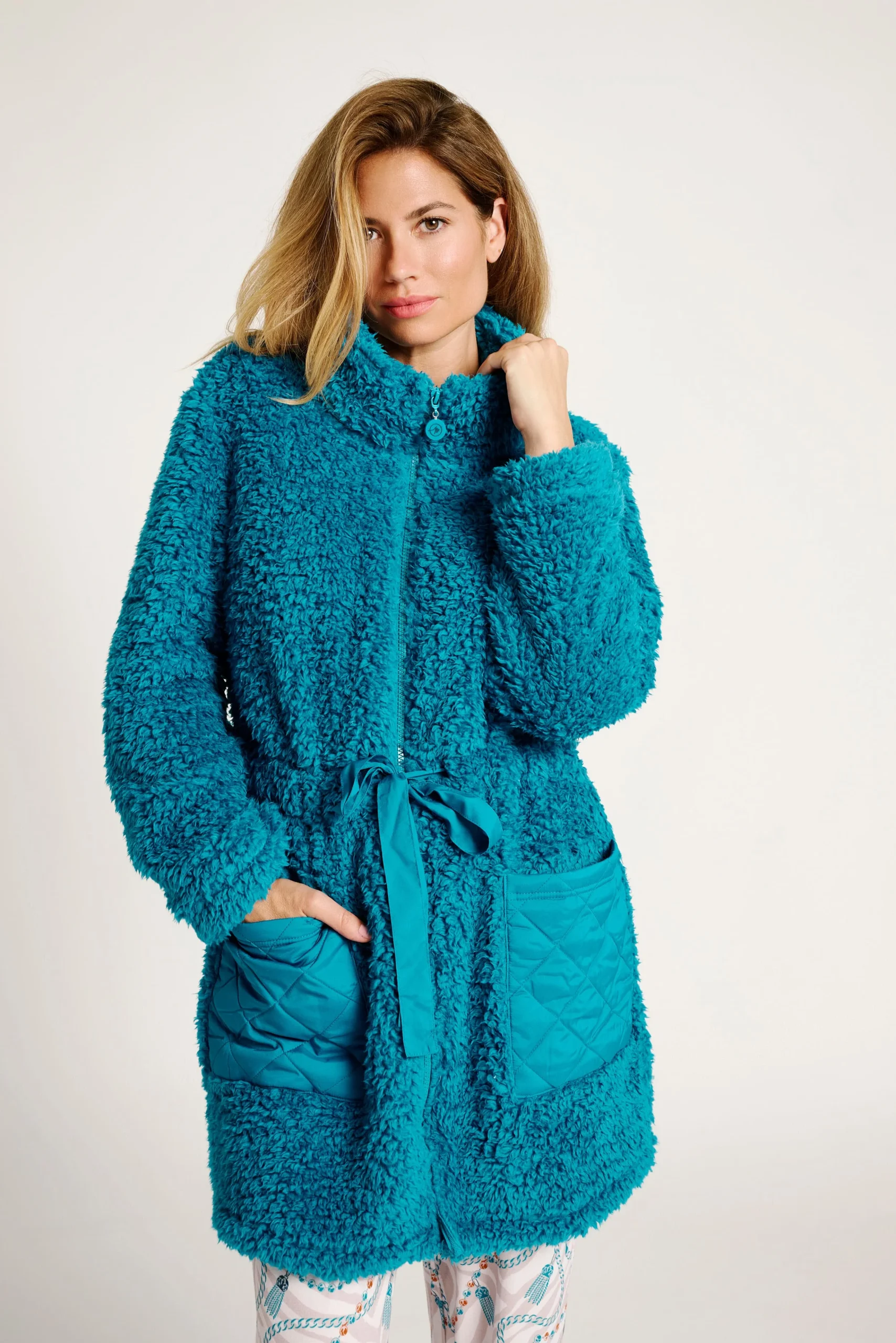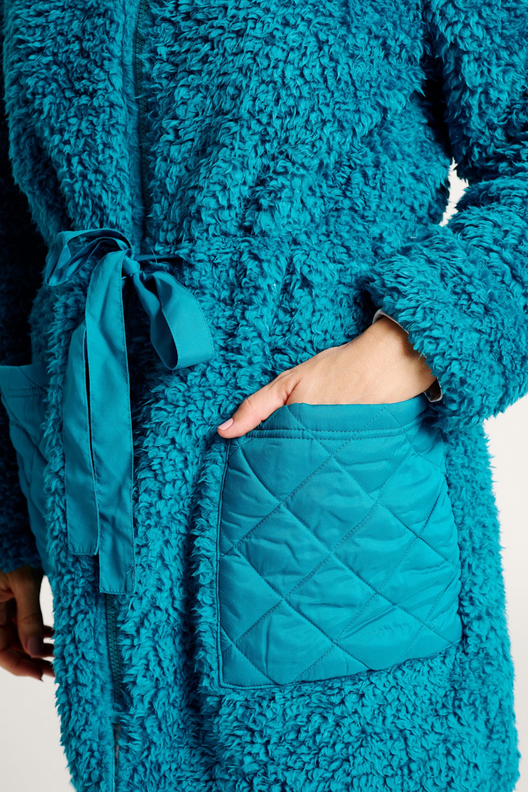 Peignoir pour femme en tissu doux effet peau de mouton, d’un bleu profond. Il est doté d’une fermeture boutonnée sur le devant, d’une ceinture réglable et de deux grandes poches matelassées en tissu matelassé contrastant. Son design chaleureux et moderne est idéal pour profiter du confort de votre maison par temps froid. 100 % polyester. […]
