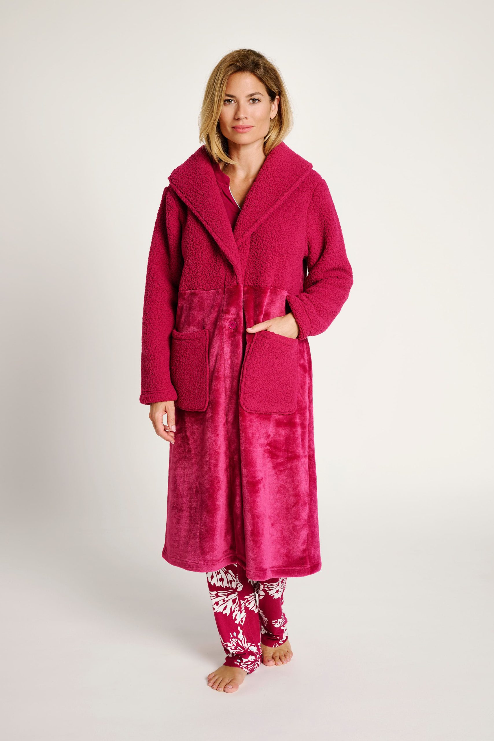 Longue robe couleur fraise alliant la chaleur du shearling sur le dessus et la douceur du polaire sur le dessous. Elle est dotée d’une fermeture boutonnée, de grandes poches avant et d’une capuche pour plus de chaleur. Design confortable et élégant, idéal pour rester au chaud à la maison par temps froid.
