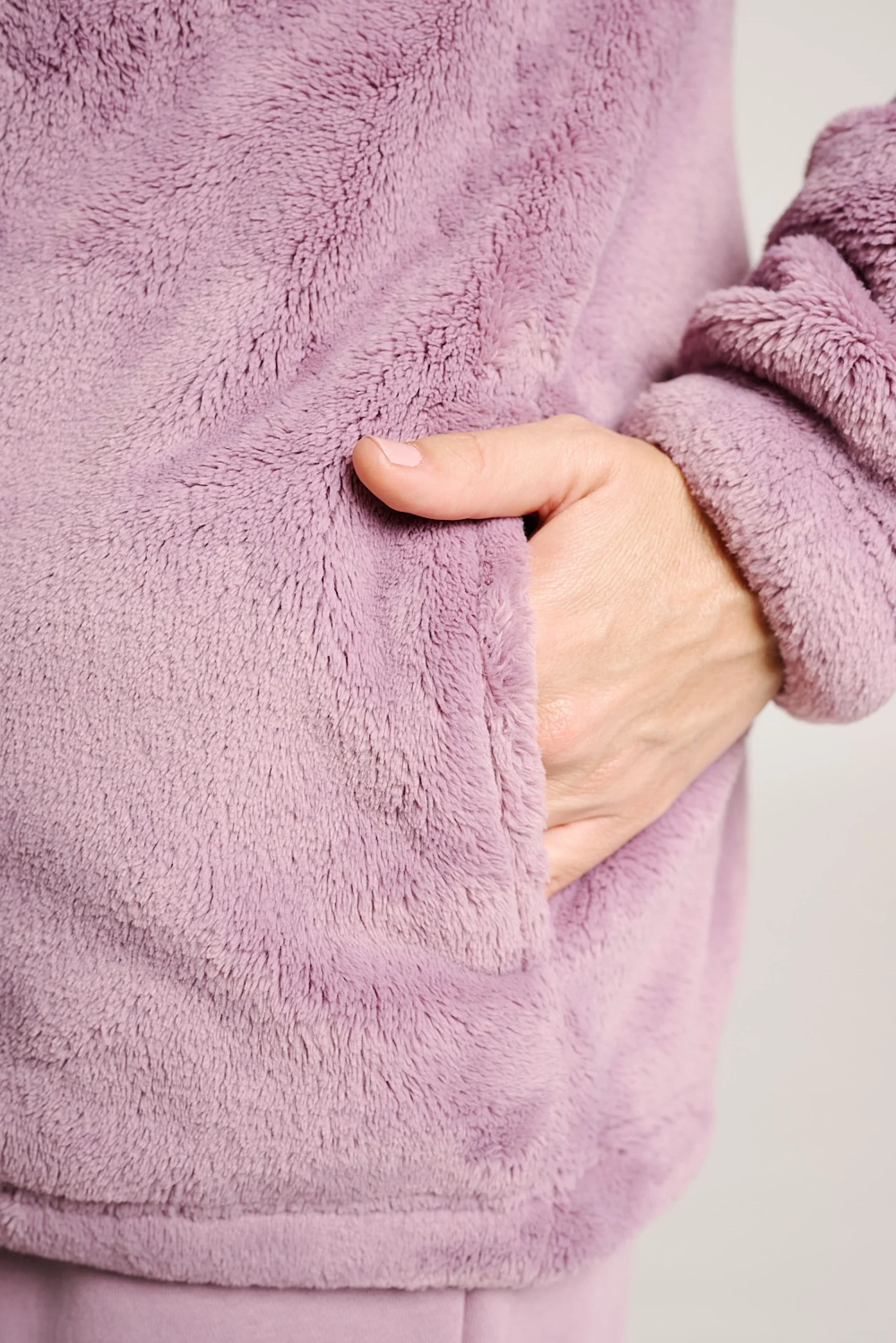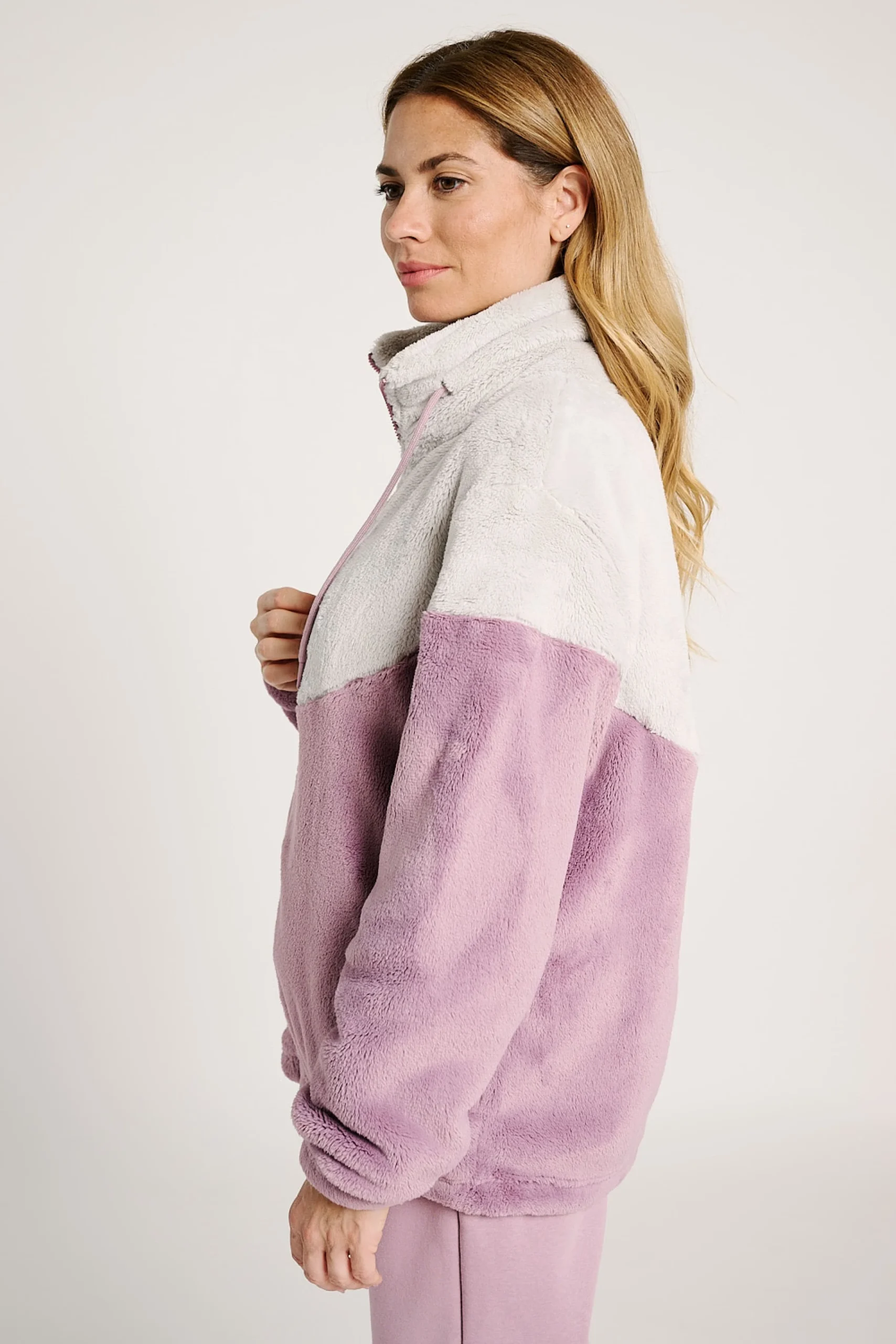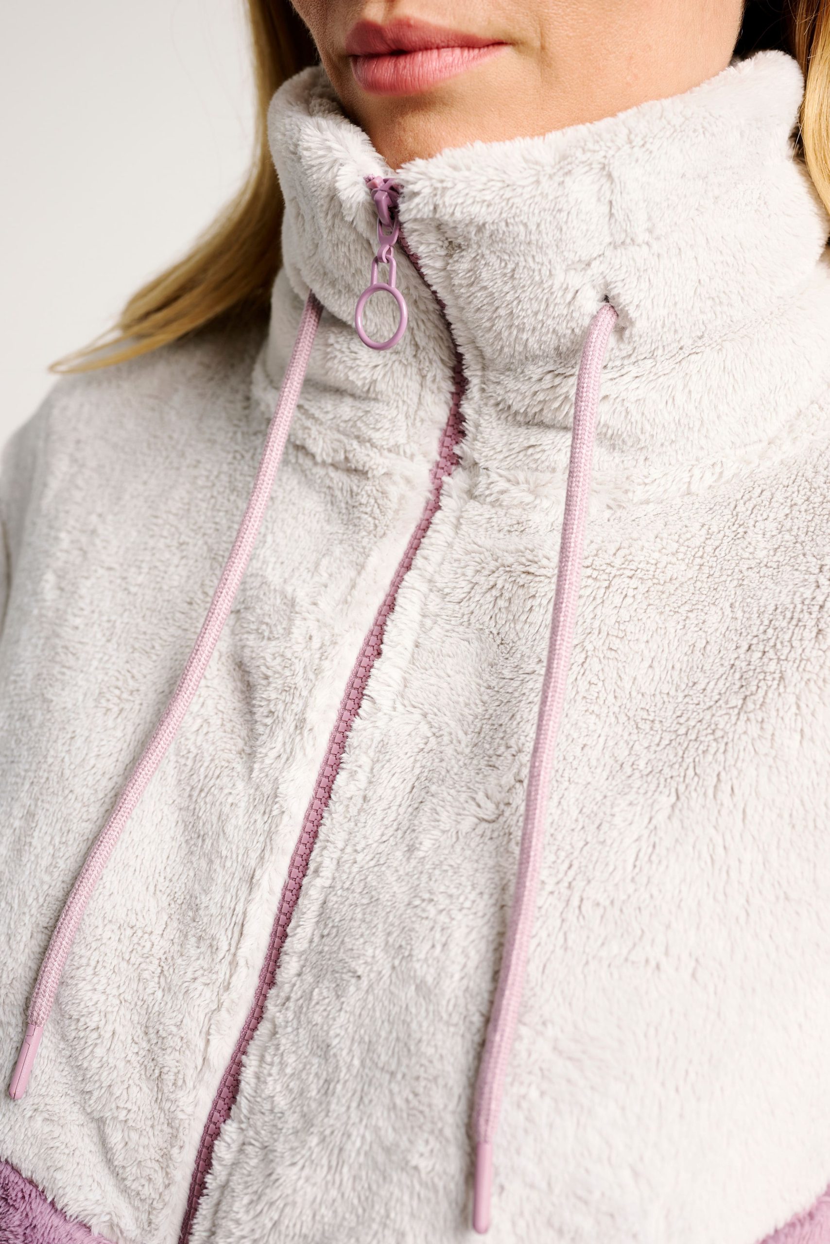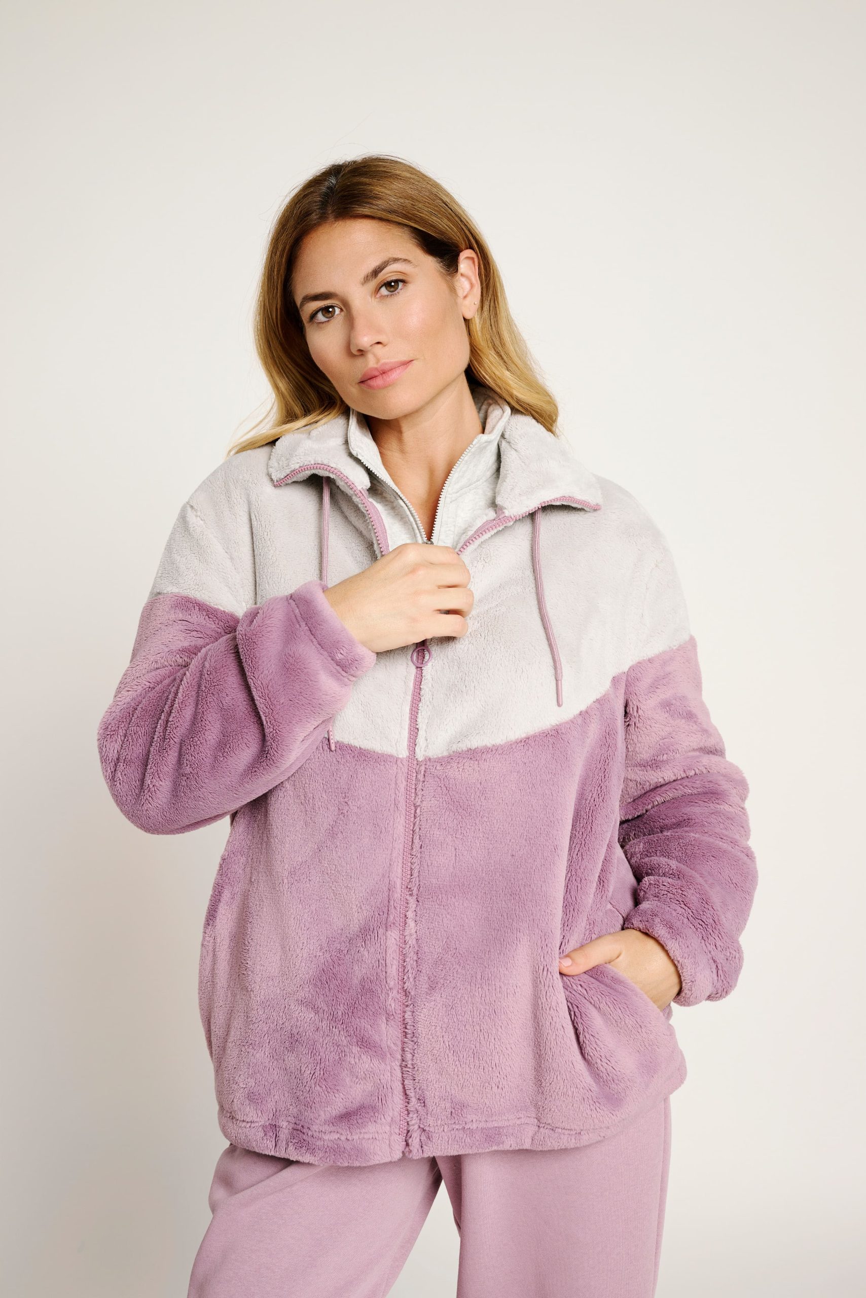 Veste polaire douce aux coloris lilas et gris clair. Elle est dotée d’une fermeture zippée sur le devant, d’un col montant avec cordons de serrage réglables et de poches latérales pratiques. Un modèle confortable et chaud, idéal pour se détendre à la maison ou pour un look décontracté par temps froid.
