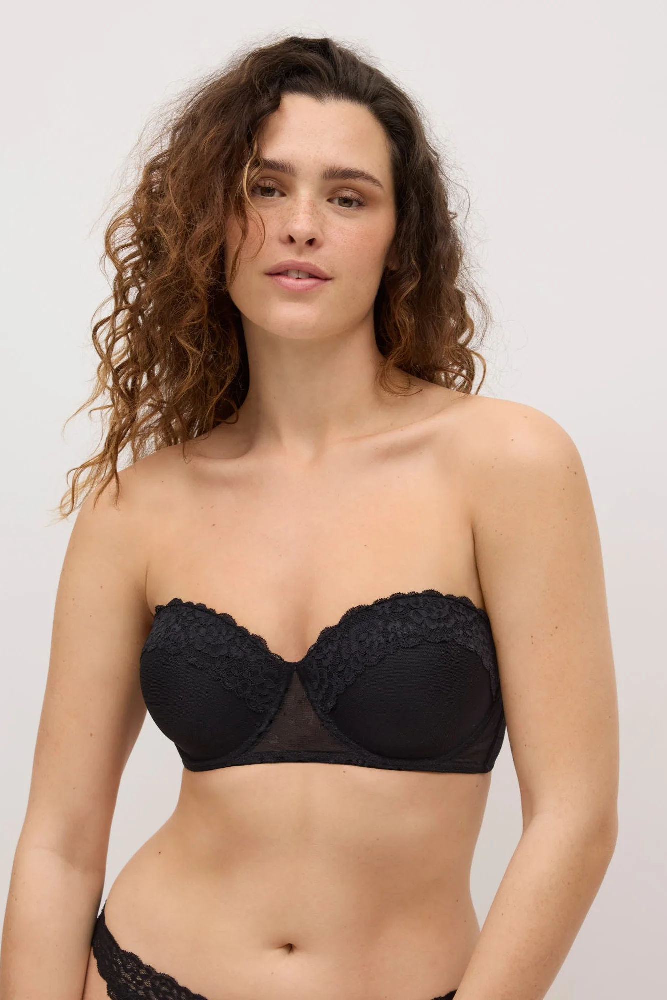 Soutien-gorge multiposition avec armatures et sans rembourrage. Bretelles réglables avec fermetures doublées. Détails en plumeti et dentelle. Associez-le à une culotte de la collection et complétez votre look lingerie. Couleur noire.