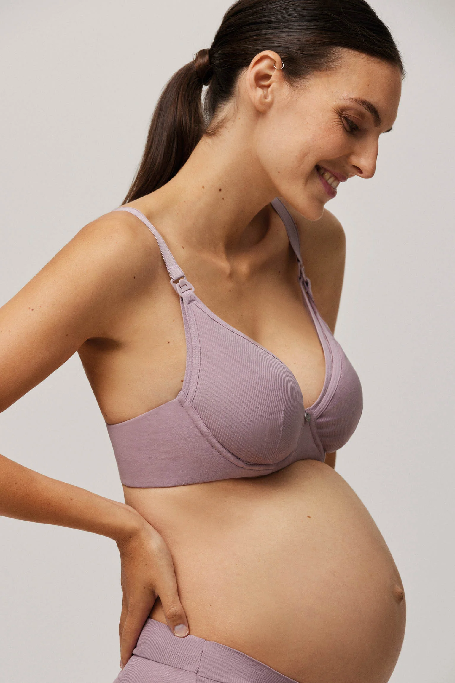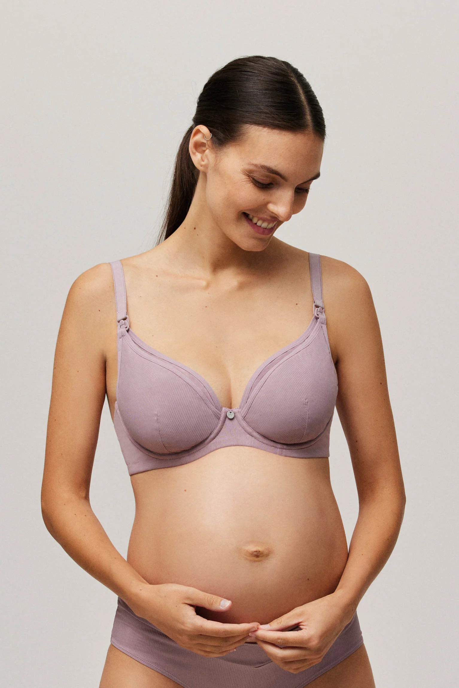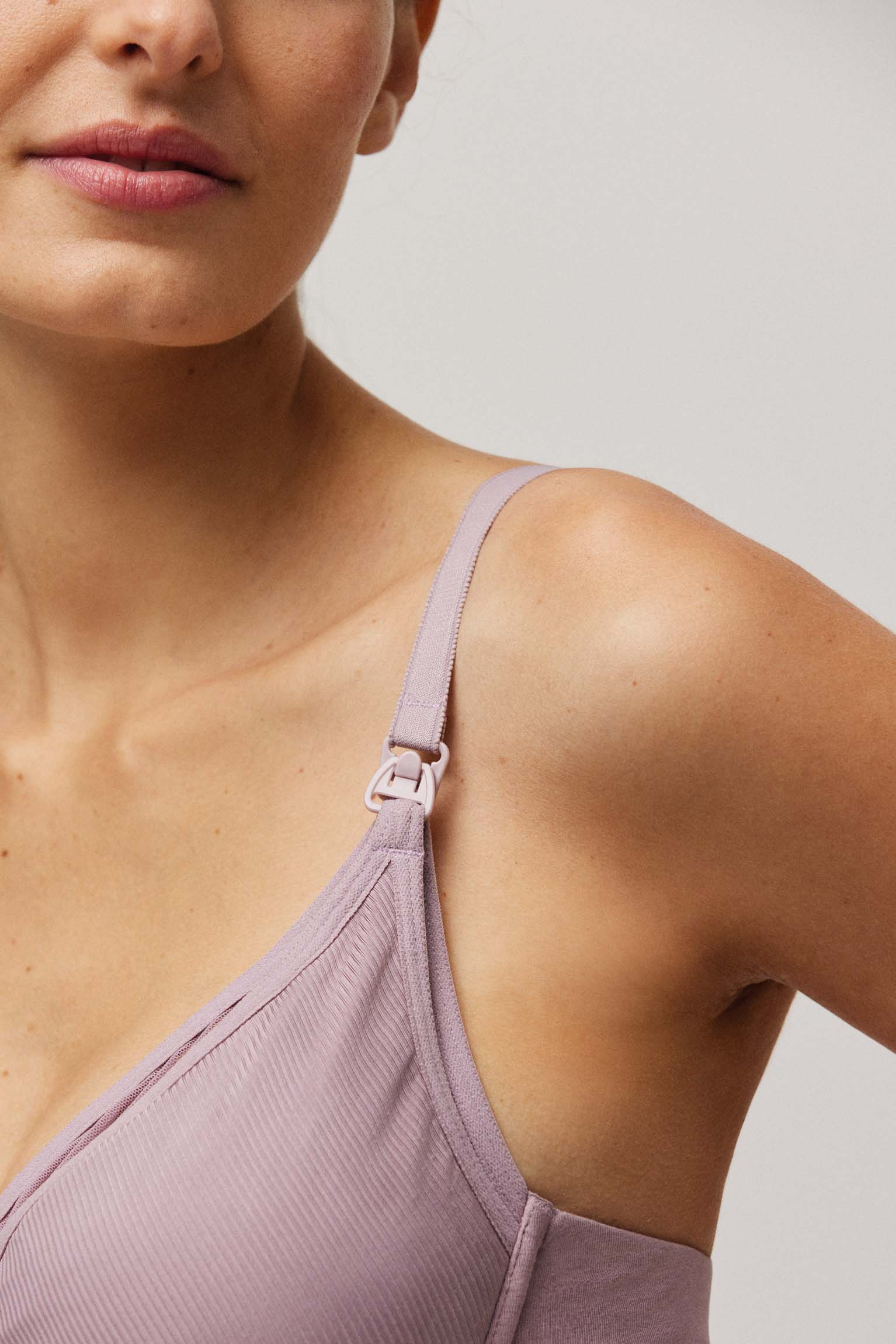 Soutien-gorge d’allaitement avec bretelles réglables et fermeture au dos. Couleur lilas.