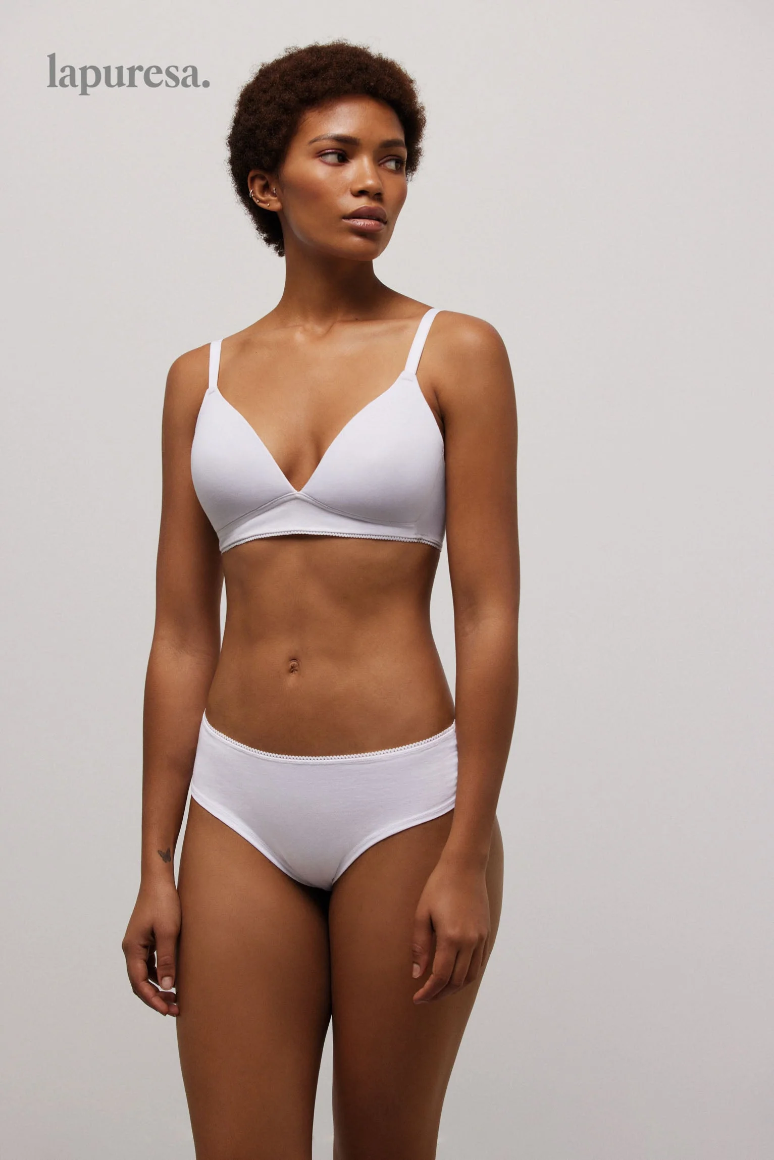 lapuresa Collection de lingerie durable. Vêtements tissés en coton biologique avec certificat GOTS. Douceur et flexibilité dans des designs inspirés de la nature et minimalistes dans la forme et les couleurs. Des tons décontractés en parfaite harmonie pour combiner des ensembles les uns avec les autres. Une collection qui respecte l’environnement créée sous les paramètres maximaux de confort et de bien-être pour votre corps. Soutien-gorge rembourré sans armatures conçu avec une encolure triangle. Fermeture à agrafes au dos et doublée pour plus de confort. Bretelles réglables avec régulateurs métalliques assortis.