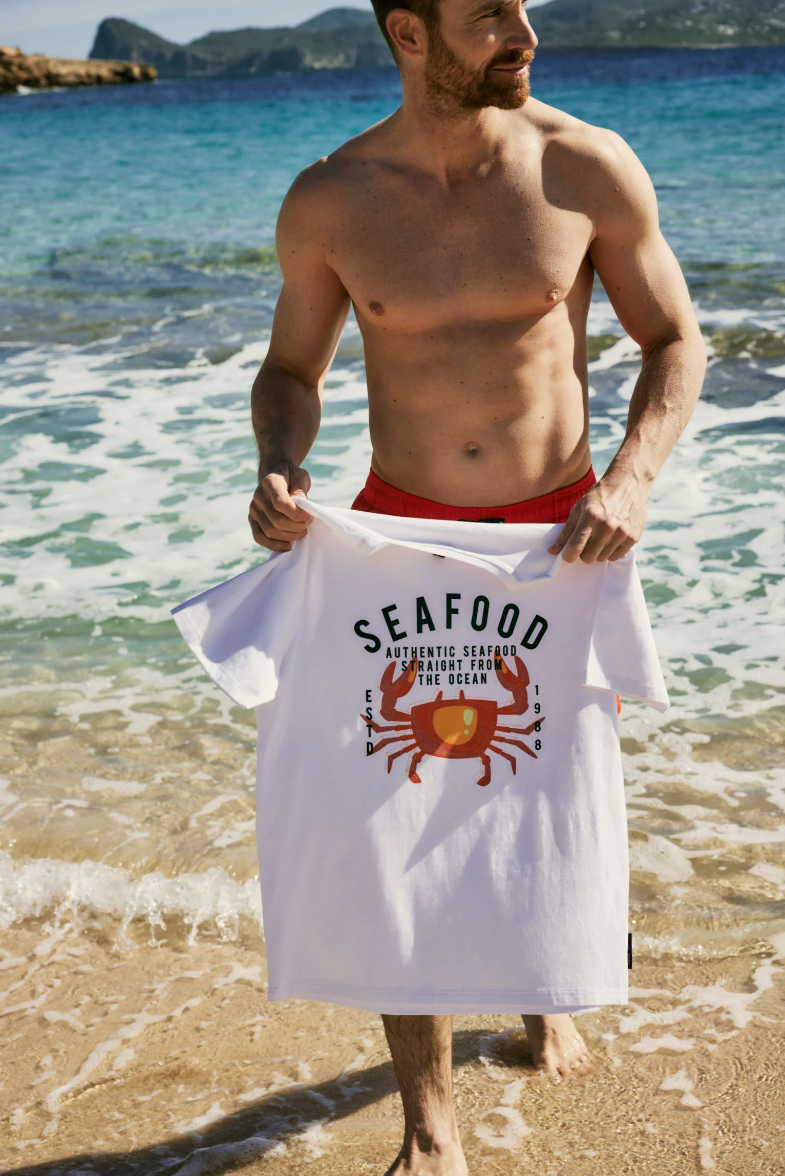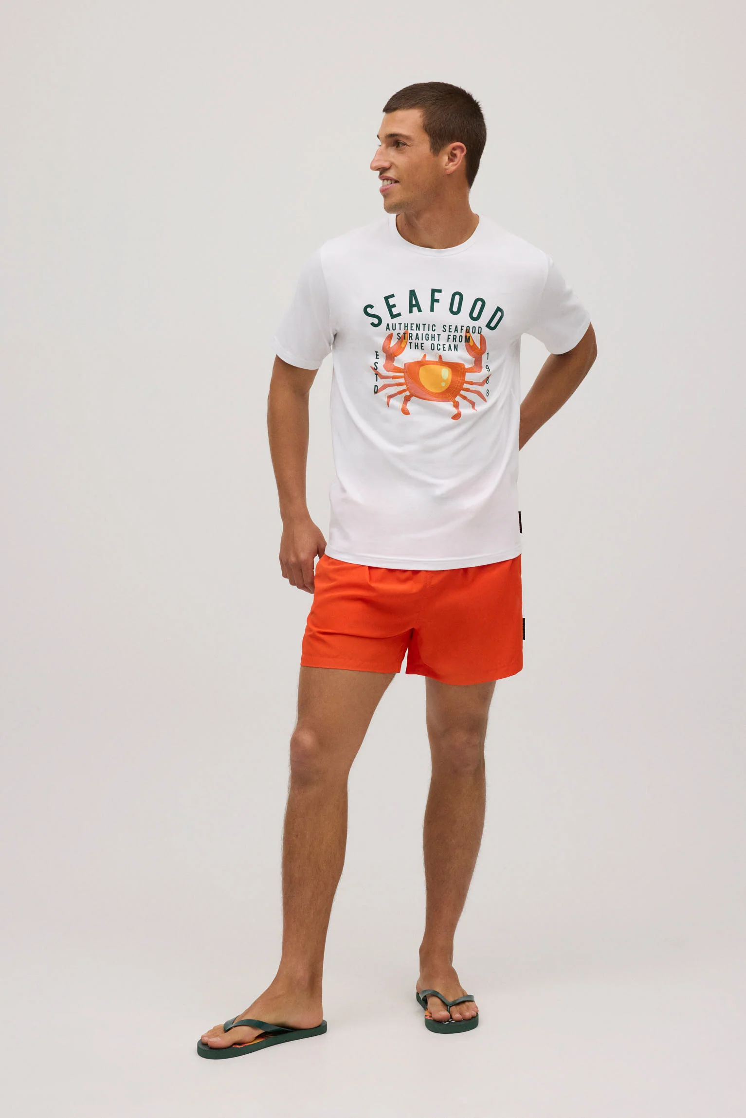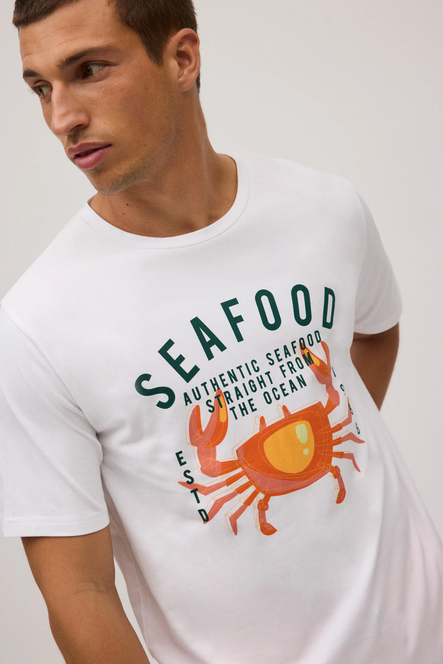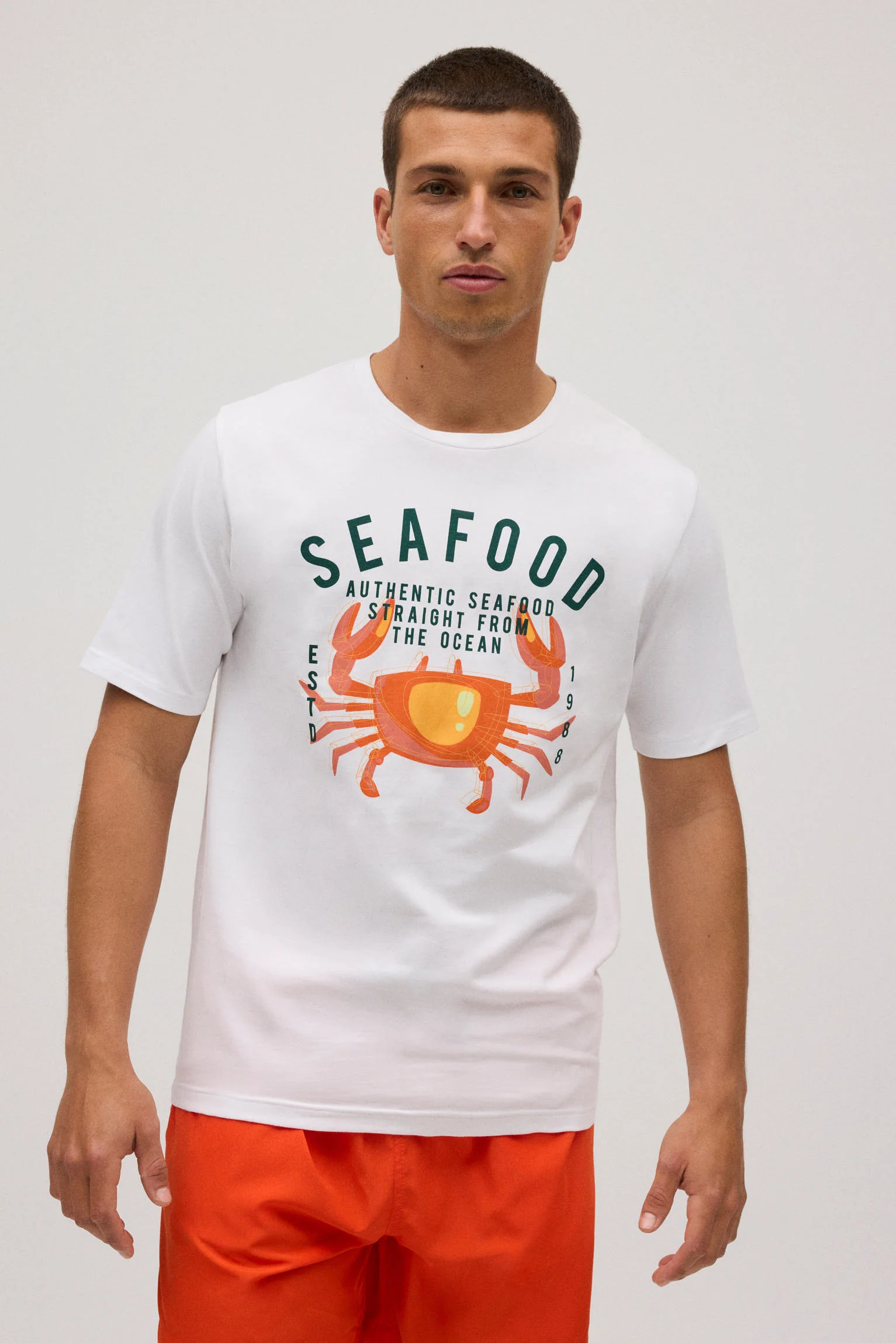 T-shirt homme blanc « SEAFOOD » et dessin de crabe. Il a une coupe Regular Fit, s’adaptant au corps. Fabriqué en coton naturel, doux et respirant pour un usage quotidien. 95 % coton, 5 % élasthanne