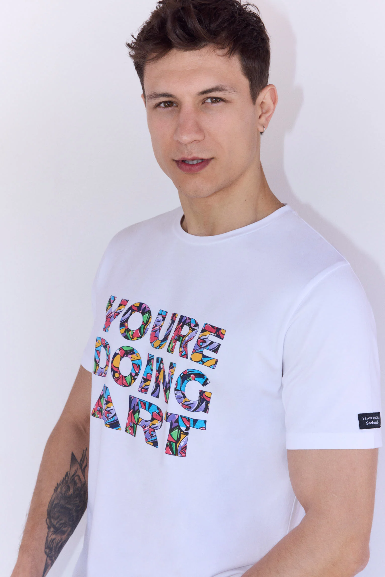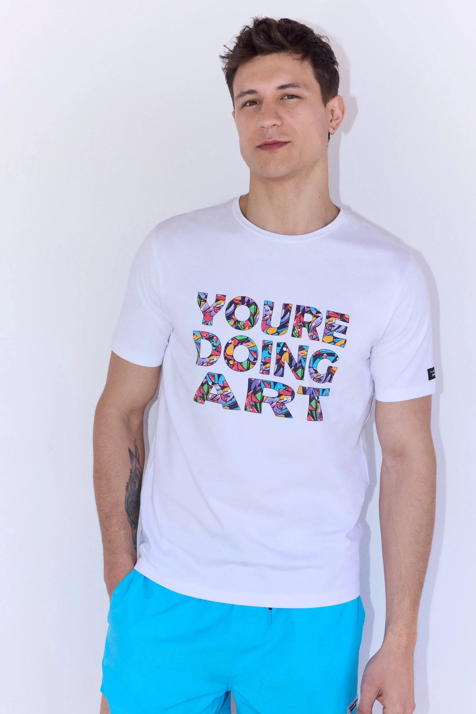Collection Sockarrats. T-shirt graphique pour hommes « YOURE DOING ART ». Il a une coupe Regular Fit, s’adaptant au corps. Fabriqué en coton naturel, doux et respirant pour un usage quotidien. Fond blanc. 95% Coton, 5% Élasthanne