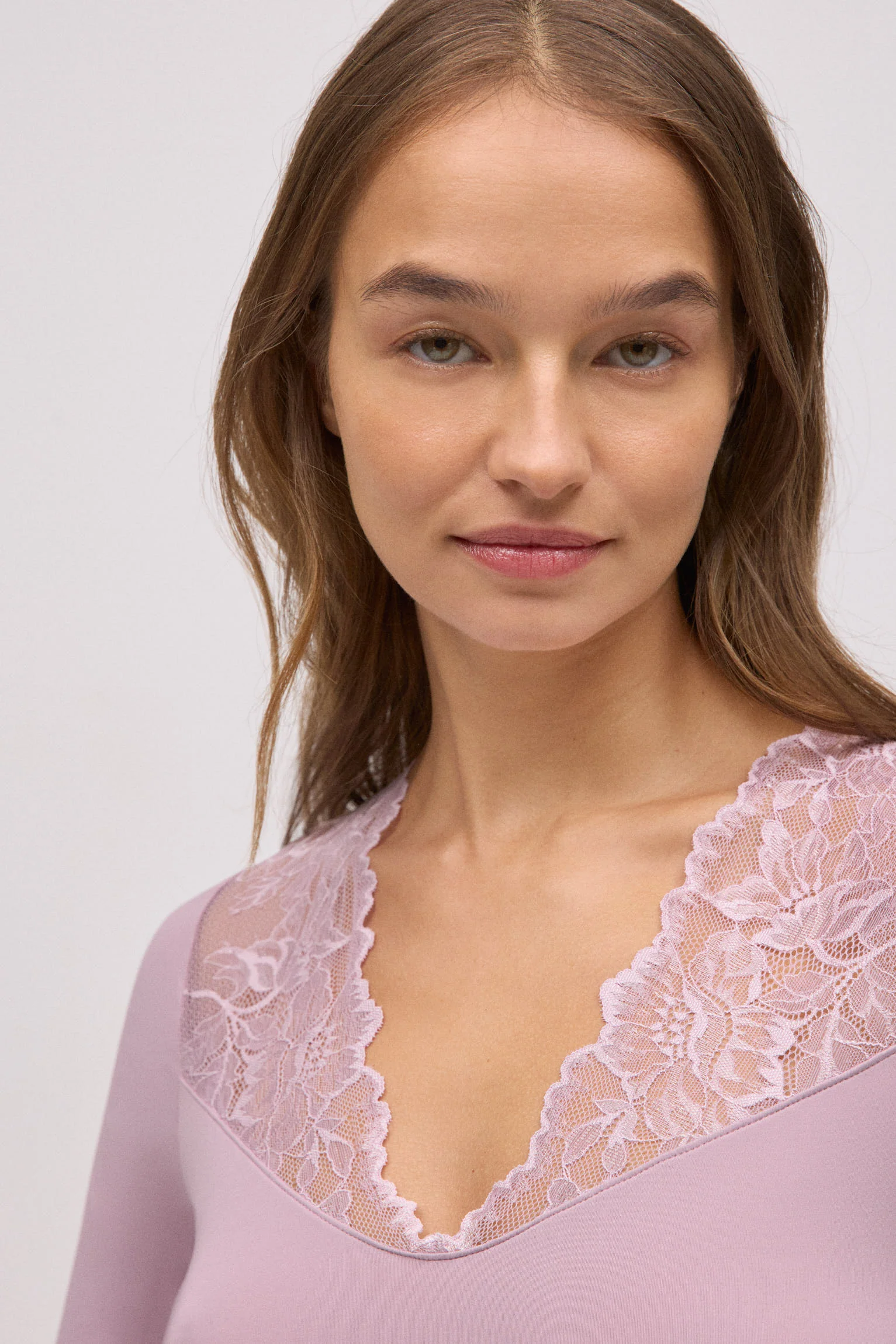 T-shirt extensible à manches longues au design alliant confort et sophistication. Son décolleté en V est rehaussé d’une délicate dentelle florale semi-transparente, apportant une touche sensuelle sans sacrifier l’élégance. Idéal comme sous-vêtement ou pour des looks d’extérieur élégants.