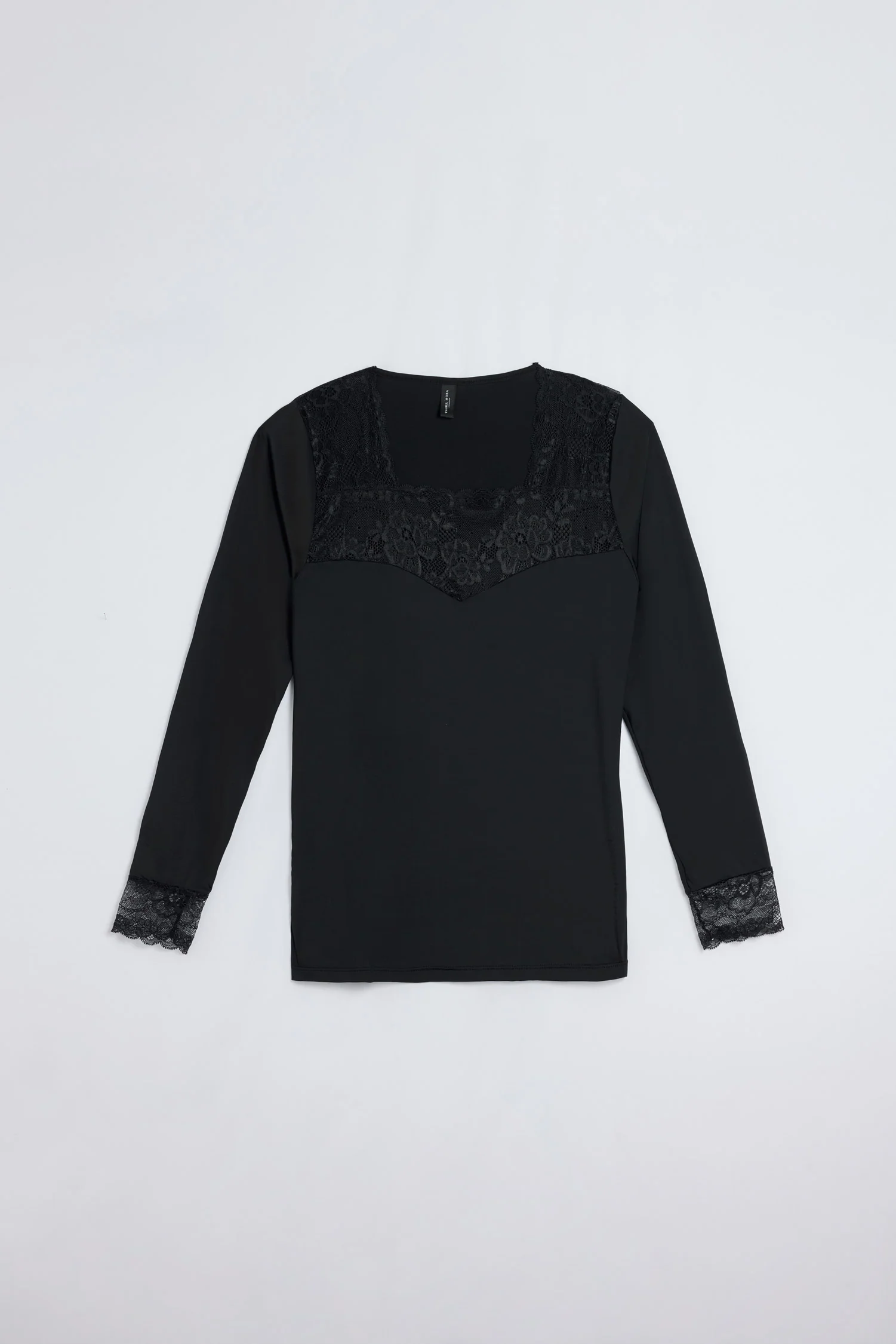 T-shirt noir à manches longues en dentelle avec encolure et poignets