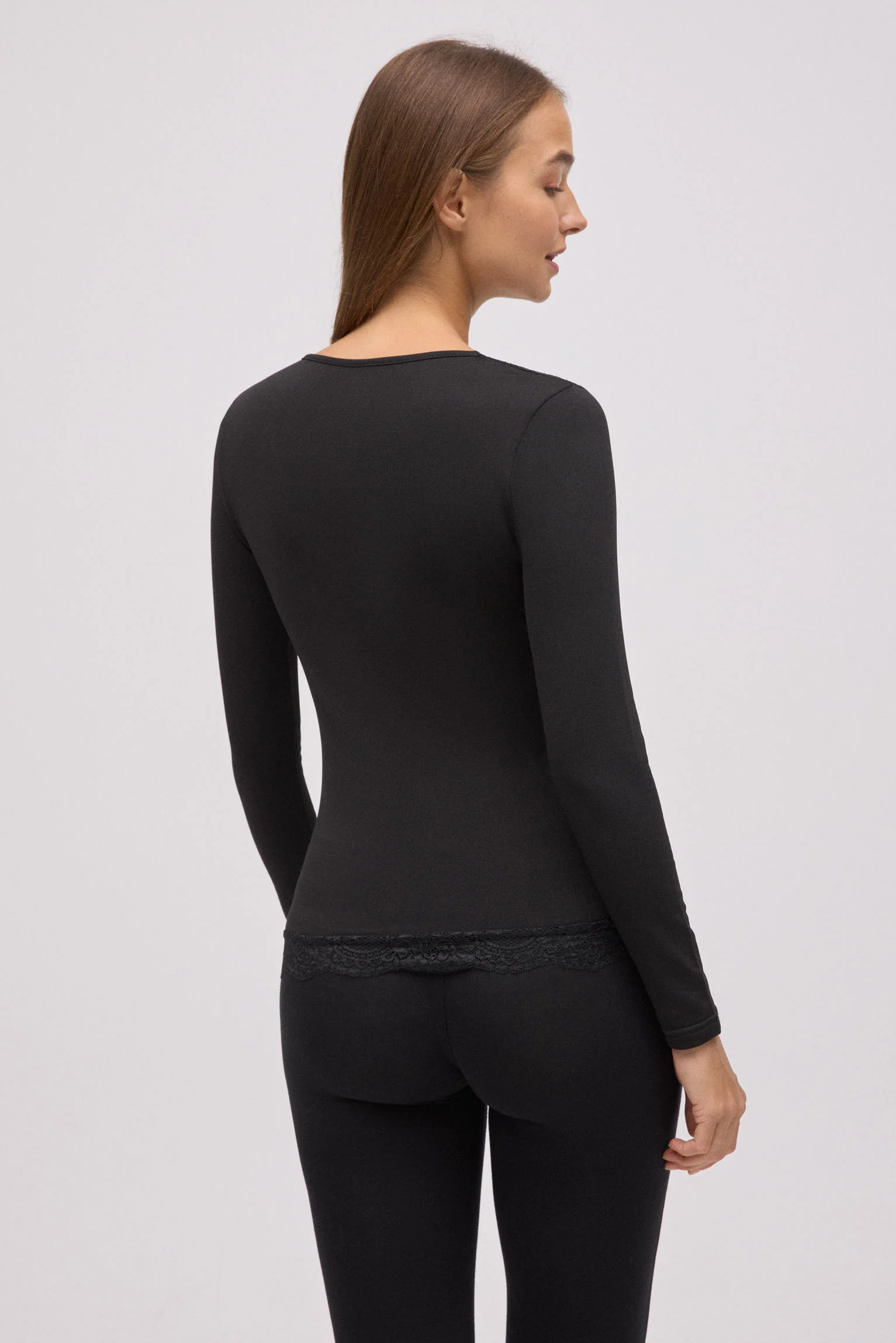 T-shirt thermique col V avec dentelle noire