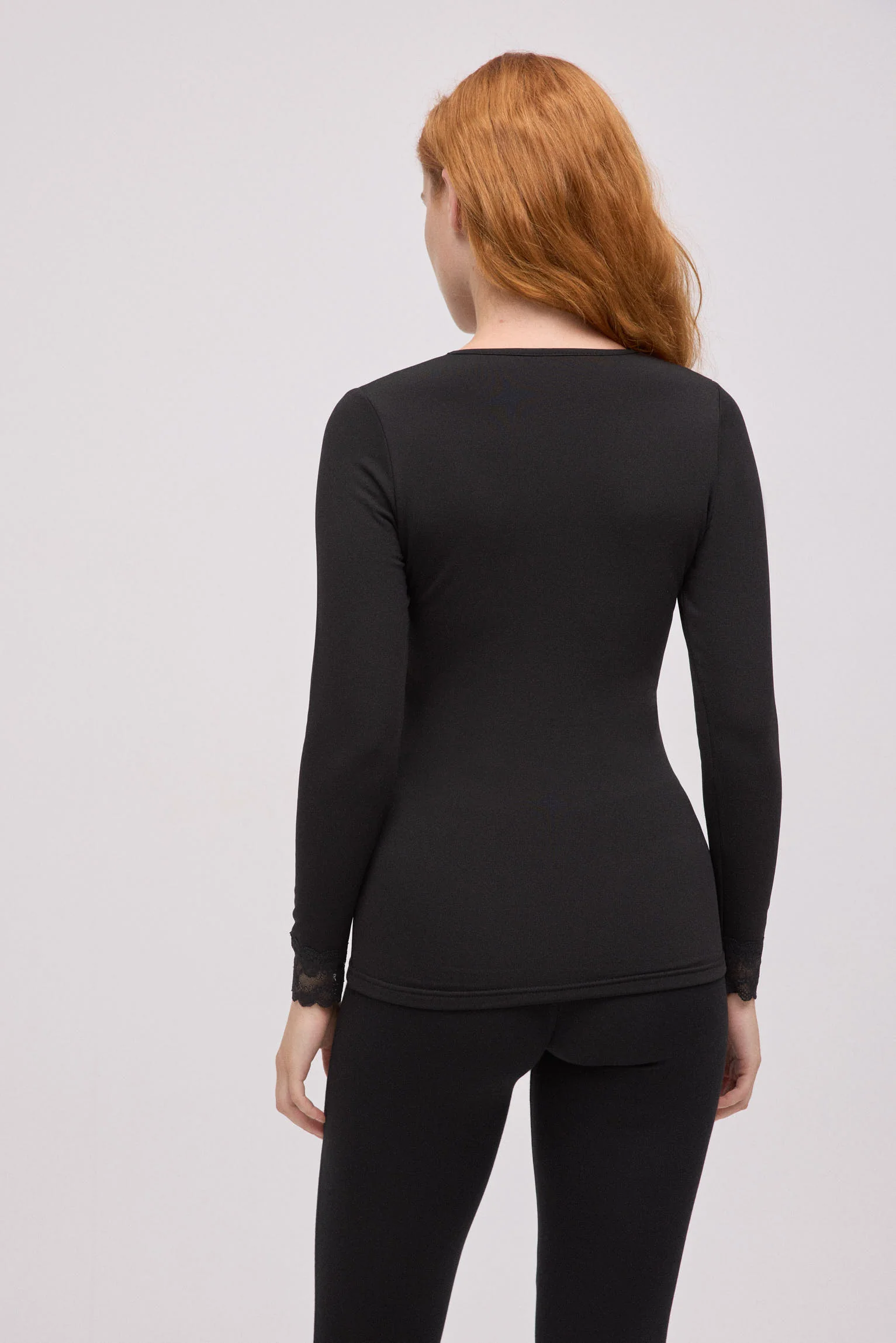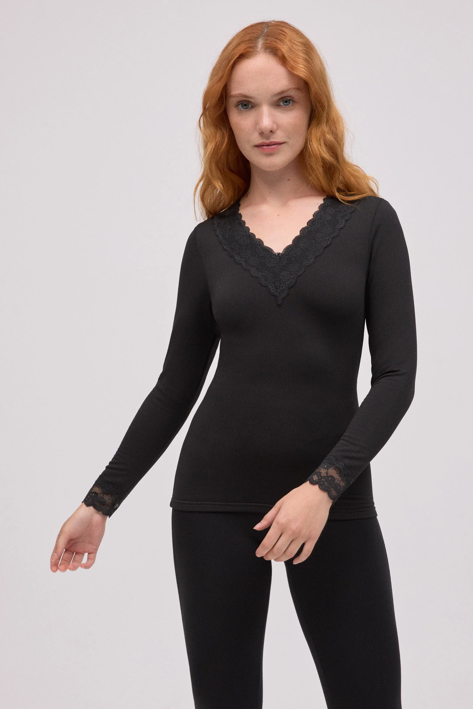 Haut thermique à manches longues pour femme, doté d’un élégant col en V bordé de dentelle pour une touche féminine et délicate. Confectionné en tissu thermique doux, il est idéal pour vous garder au chaud lors des journées fraîches, en tout confort. Son design uni, associé à des détails en dentelle à l’encolure et aux poignets, en fait une pièce polyvalente à porter en superposition ou pour un look hivernal plus sophistiqué.